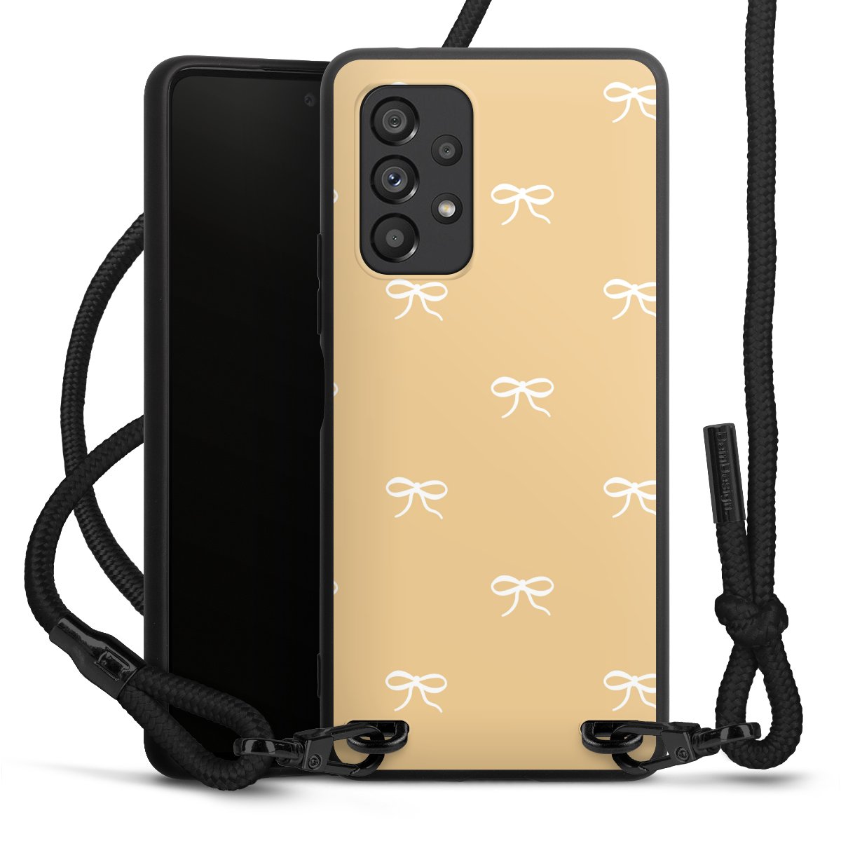 The matt black silicone case is made of flexible TPU (thermoplastic polyurethane) and offers robust protection. The durable, unbreakable material makes the cover flexible and dimensionally stable at the same time. The matte surface makes your design stand out more and is less susceptible to fingerprints and dirt. The stylish trend accessory fits comfortably in the hand and is perfectly complemented by the fabric (polyester) mobile phone strap. The braided fabric strap is approx. 1.70 metres long with a diameter of approx. 0.5 cm. Due to the special knotting technique, the length of the strap can be adjusted by simply pulling it, so that you can adapt it individually to your wishes. The practical case to wear around your neck is available with the fabric strap in black. As a little icing on the cake, we have provided the strap with a chic metal fastener in matt black. The strap is securely fastened to the case with loops made of high-quality genuine leather and press studs. The ends of the fabric strap are covered with metallic end caps and thus protected from fraying.
