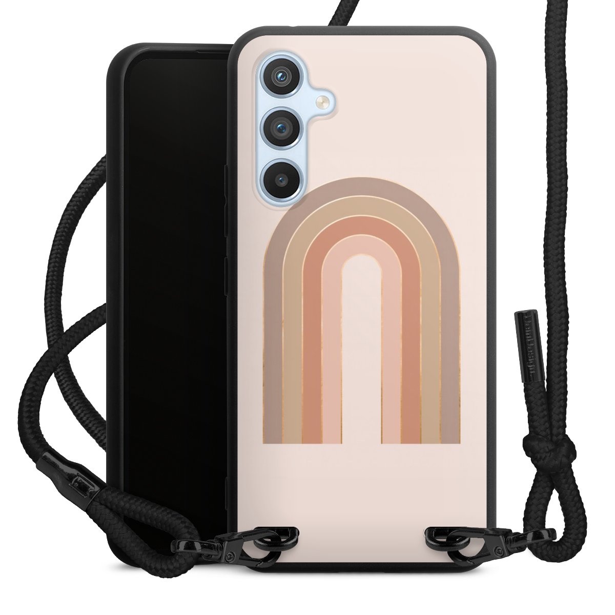 The matt black silicone case is made of flexible TPU (thermoplastic polyurethane) and offers robust protection. The durable, unbreakable material makes the cover flexible and dimensionally stable at the same time. The matte surface makes your design stand out more and is less susceptible to fingerprints and dirt. The stylish trend accessory fits comfortably in the hand and is perfectly complemented by the fabric (polyester) mobile phone strap. The braided fabric strap is approx. 1.70 metres long with a diameter of approx. 0.5 cm. Due to the special knotting technique, the length of the strap can be adjusted by simply pulling it, so that you can adapt it individually to your wishes. The practical case to wear around your neck is available with the fabric strap in black. As a little icing on the cake, we have provided the strap with a chic metal fastener in matt black. The strap is securely fastened to the case with loops made of high-quality genuine leather and press studs. The ends of the fabric strap are covered with metallic end caps and thus protected from fraying.