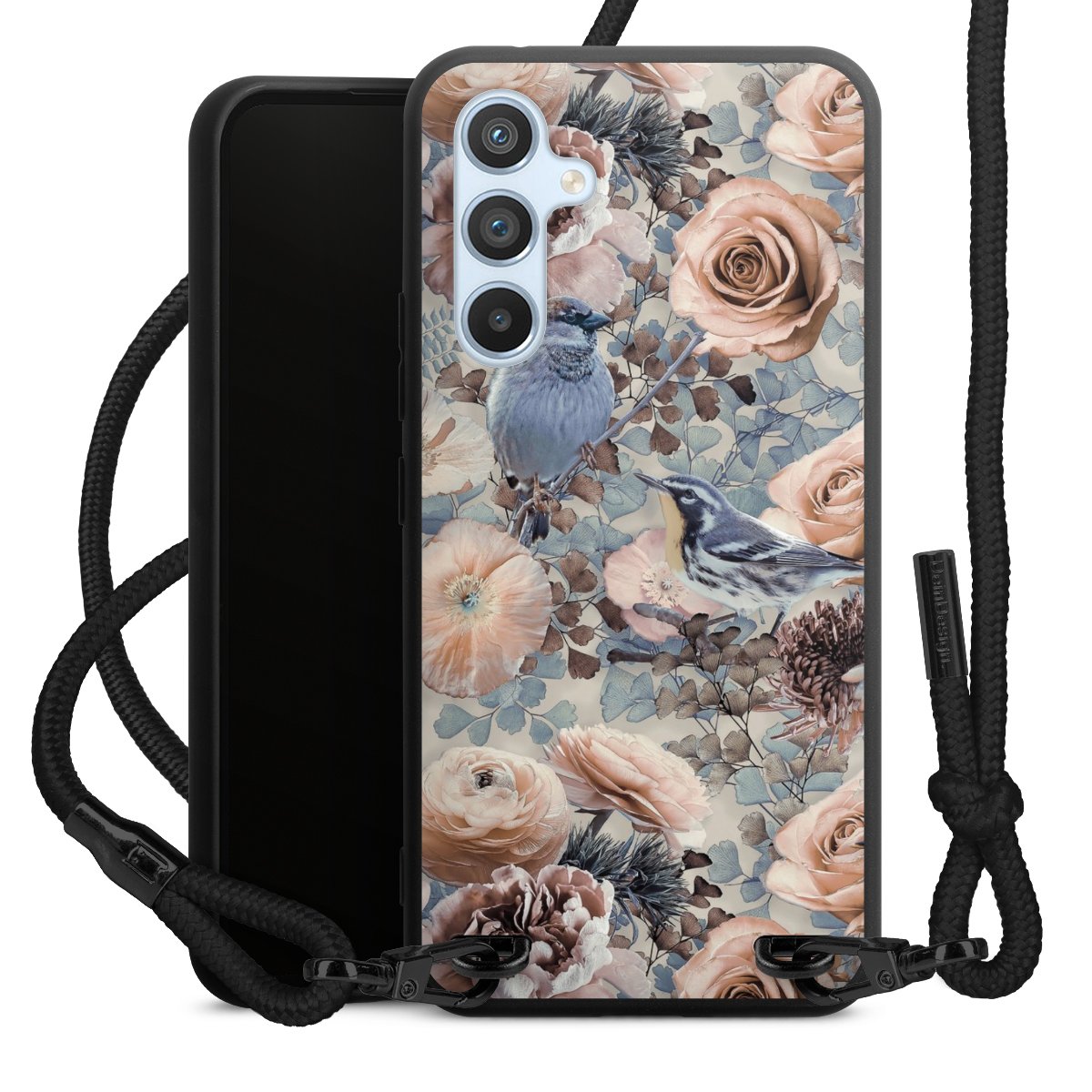 The matt black silicone case is made of flexible TPU (thermoplastic polyurethane) and offers robust protection. The durable, unbreakable material makes the cover flexible and dimensionally stable at the same time. The matte surface makes your design stand out more and is less susceptible to fingerprints and dirt. The stylish trend accessory fits comfortably in the hand and is perfectly complemented by the fabric (polyester) mobile phone strap. The braided fabric strap is approx. 1.70 metres long with a diameter of approx. 0.5 cm. Due to the special knotting technique, the length of the strap can be adjusted by simply pulling it, so that you can adapt it individually to your wishes. The practical case to wear around your neck is available with the fabric strap in black. As a little icing on the cake, we have provided the strap with a chic metal fastener in matt black. The strap is securely fastened to the case with loops made of high-quality genuine leather and press studs. The ends of the fabric strap are covered with metallic end caps and thus protected from fraying.