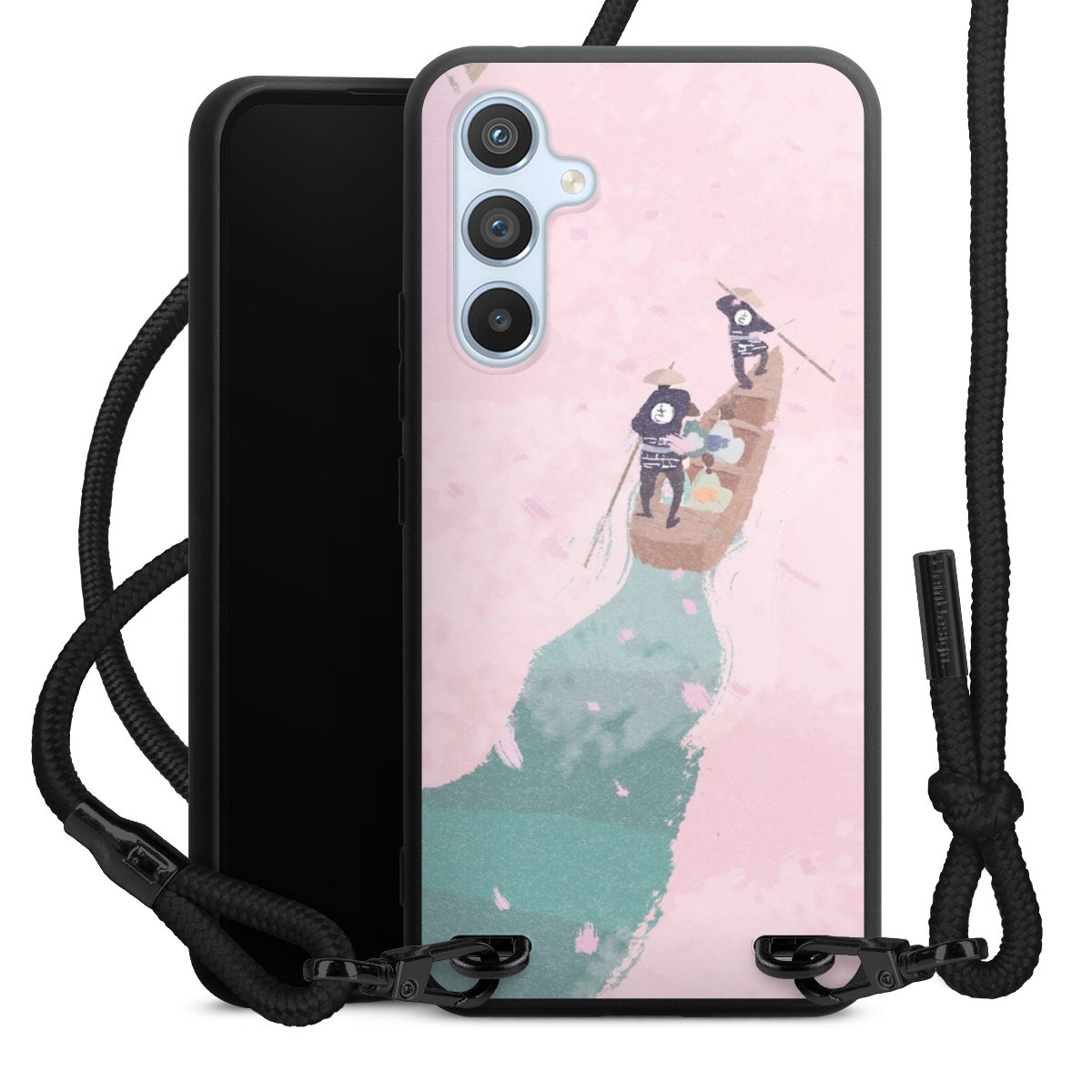 The matt black silicone case is made of flexible TPU (thermoplastic polyurethane) and offers robust protection. The durable, unbreakable material makes the cover flexible and dimensionally stable at the same time. The matte surface makes your design stand out more and is less susceptible to fingerprints and dirt. The stylish trend accessory fits comfortably in the hand and is perfectly complemented by the fabric (polyester) mobile phone strap. The braided fabric strap is approx. 1.70 metres long with a diameter of approx. 0.5 cm. Due to the special knotting technique, the length of the strap can be adjusted by simply pulling it, so that you can adapt it individually to your wishes. The practical case to wear around your neck is available with the fabric strap in black. As a little icing on the cake, we have provided the strap with a chic metal fastener in matt black. The strap is securely fastened to the case with loops made of high-quality genuine leather and press studs. The ends of the fabric strap are covered with metallic end caps and thus protected from fraying.