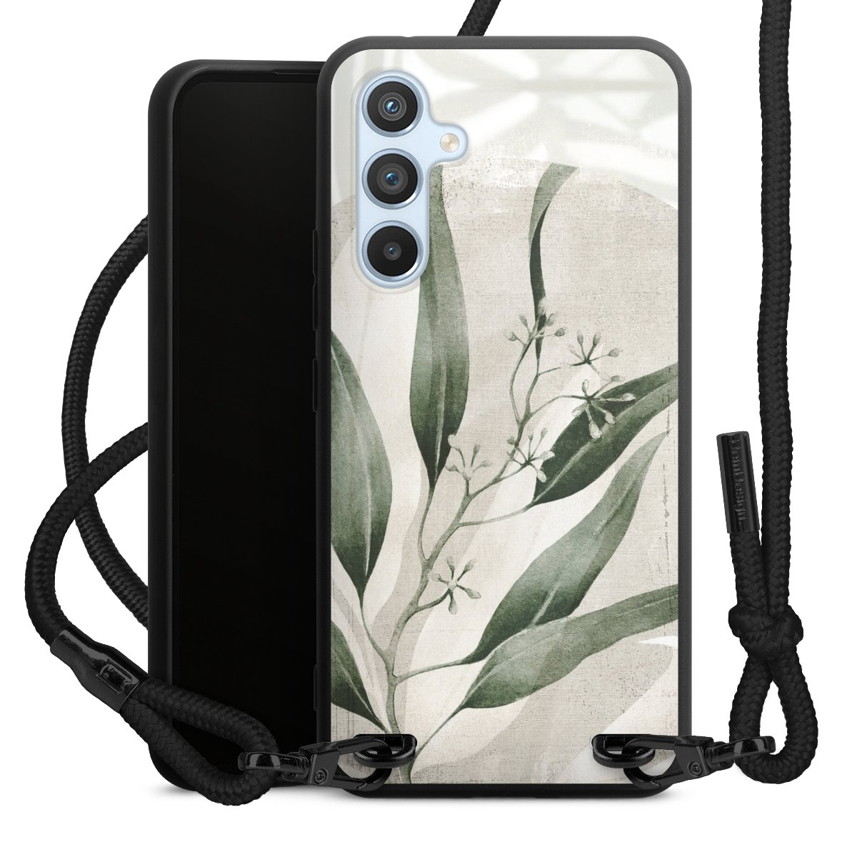 The matt black silicone case is made of flexible TPU (thermoplastic polyurethane) and offers robust protection. The durable, unbreakable material makes the cover flexible and dimensionally stable at the same time. The matte surface makes your design stand out more and is less susceptible to fingerprints and dirt. The stylish trend accessory fits comfortably in the hand and is perfectly complemented by the fabric (polyester) mobile phone strap. The braided fabric strap is approx. 1.70 metres long with a diameter of approx. 0.5 cm. Due to the special knotting technique, the length of the strap can be adjusted by simply pulling it, so that you can adapt it individually to your wishes. The practical case to wear around your neck is available with the fabric strap in black. As a little icing on the cake, we have provided the strap with a chic metal fastener in matt black. The strap is securely fastened to the case with loops made of high-quality genuine leather and press studs. The ends of the fabric strap are covered with metallic end caps and thus protected from fraying.