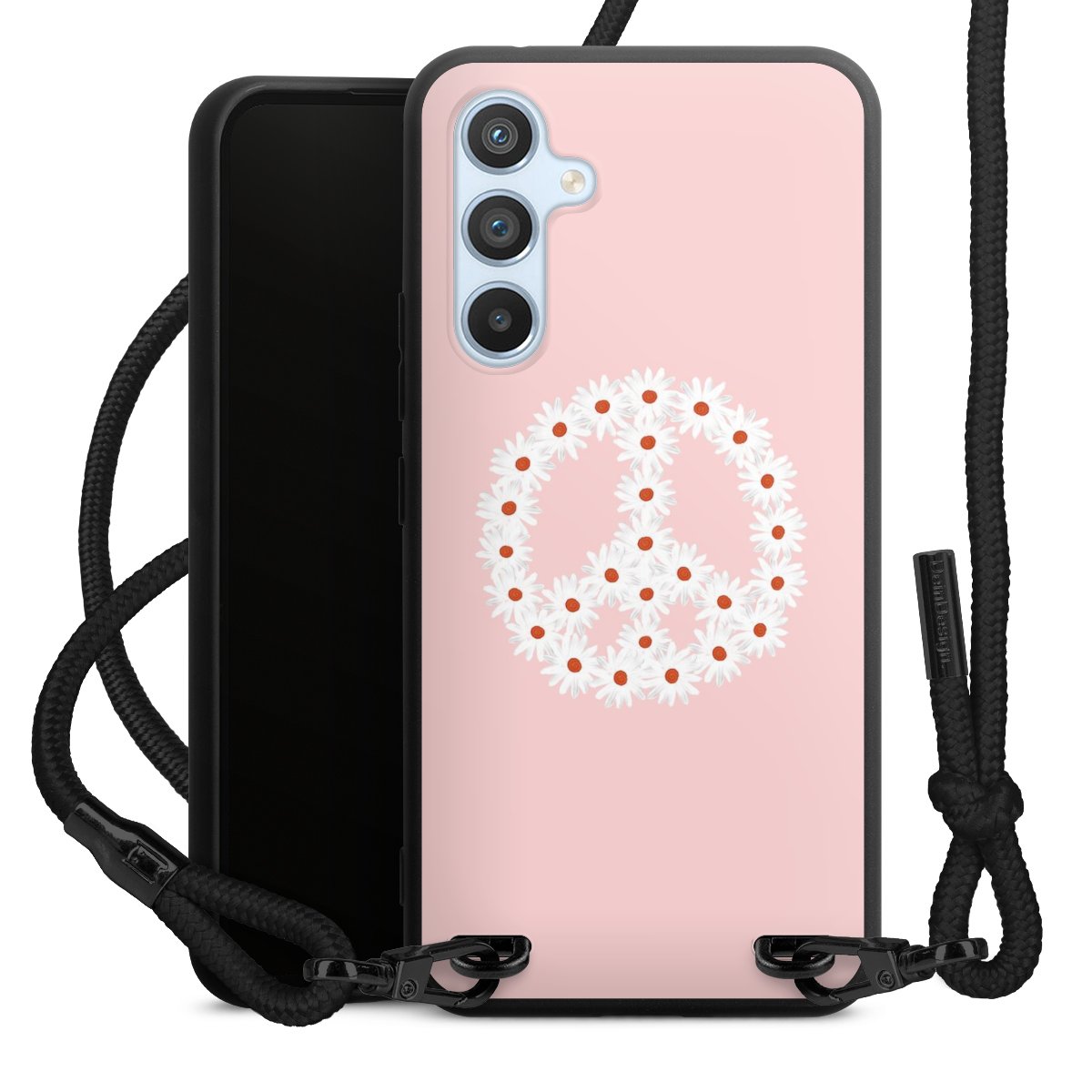 The matt black silicone case is made of flexible TPU (thermoplastic polyurethane) and offers robust protection. The durable, unbreakable material makes the cover flexible and dimensionally stable at the same time. The matte surface makes your design stand out more and is less susceptible to fingerprints and dirt. The stylish trend accessory fits comfortably in the hand and is perfectly complemented by the fabric (polyester) mobile phone strap. The braided fabric strap is approx. 1.70 metres long with a diameter of approx. 0.5 cm. Due to the special knotting technique, the length of the strap can be adjusted by simply pulling it, so that you can adapt it individually to your wishes. The practical case to wear around your neck is available with the fabric strap in black. As a little icing on the cake, we have provided the strap with a chic metal fastener in matt black. The strap is securely fastened to the case with loops made of high-quality genuine leather and press studs. The ends of the fabric strap are covered with metallic end caps and thus protected from fraying.