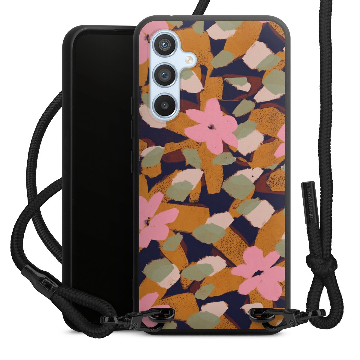 The matt black silicone case is made of flexible TPU (thermoplastic polyurethane) and offers robust protection. The durable, unbreakable material makes the cover flexible and dimensionally stable at the same time. The matte surface makes your design stand out more and is less susceptible to fingerprints and dirt. The stylish trend accessory fits comfortably in the hand and is perfectly complemented by the fabric (polyester) mobile phone strap. The braided fabric strap is approx. 1.70 metres long with a diameter of approx. 0.5 cm. Due to the special knotting technique, the length of the strap can be adjusted by simply pulling it, so that you can adapt it individually to your wishes. The practical case to wear around your neck is available with the fabric strap in black. As a little icing on the cake, we have provided the strap with a chic metal fastener in matt black. The strap is securely fastened to the case with loops made of high-quality genuine leather and press studs. The ends of the fabric strap are covered with metallic end caps and thus protected from fraying.