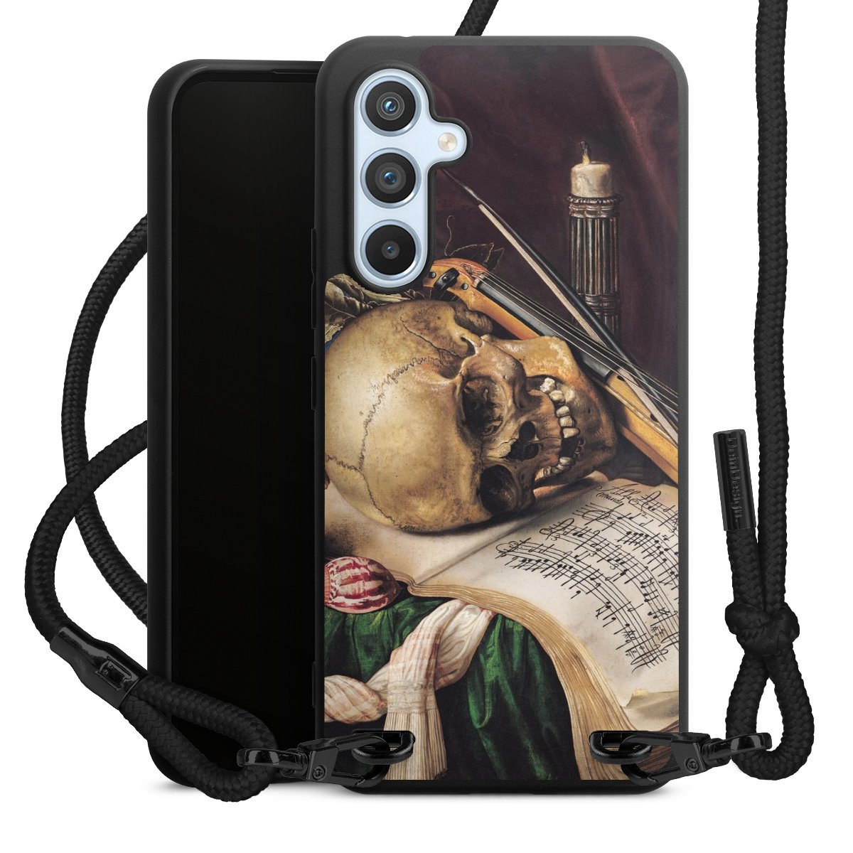 The matt black silicone case is made of flexible TPU (thermoplastic polyurethane) and offers robust protection. The durable, unbreakable material makes the cover flexible and dimensionally stable at the same time. The matte surface makes your design stand out more and is less susceptible to fingerprints and dirt. The stylish trend accessory fits comfortably in the hand and is perfectly complemented by the fabric (polyester) mobile phone strap. The braided fabric strap is approx. 1.70 metres long with a diameter of approx. 0.5 cm. Due to the special knotting technique, the length of the strap can be adjusted by simply pulling it, so that you can adapt it individually to your wishes. The practical case to wear around your neck is available with the fabric strap in black. As a little icing on the cake, we have provided the strap with a chic metal fastener in matt black. The strap is securely fastened to the case with loops made of high-quality genuine leather and press studs. The ends of the fabric strap are covered with metallic end caps and thus protected from fraying.