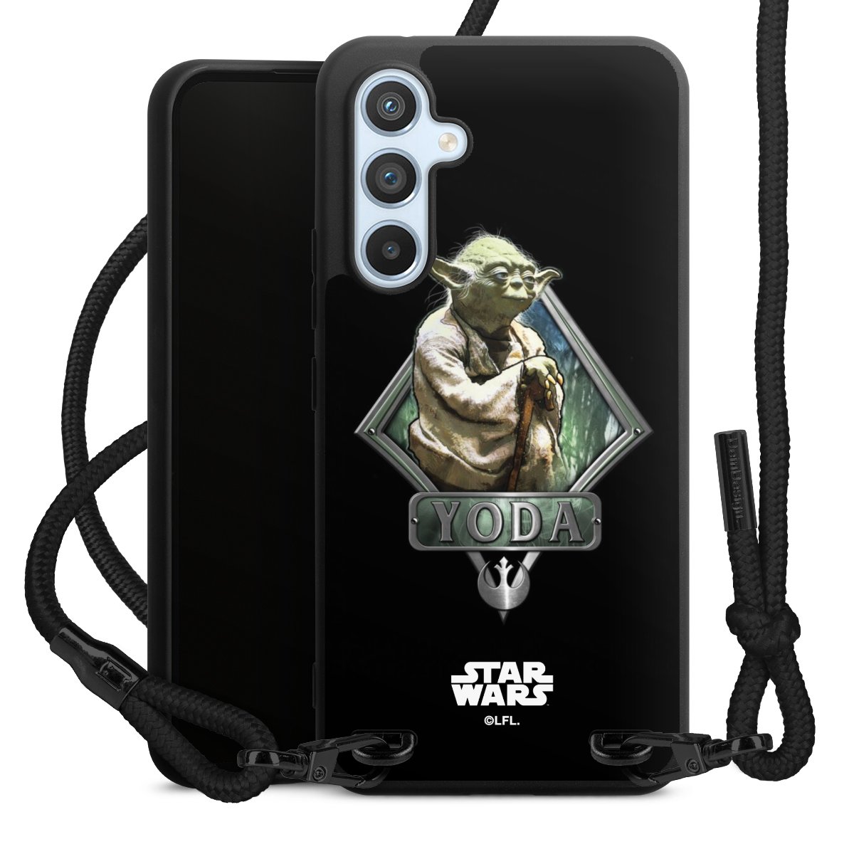 Pure Black: Phone case, fabric strap and metal details in stylish matt black.