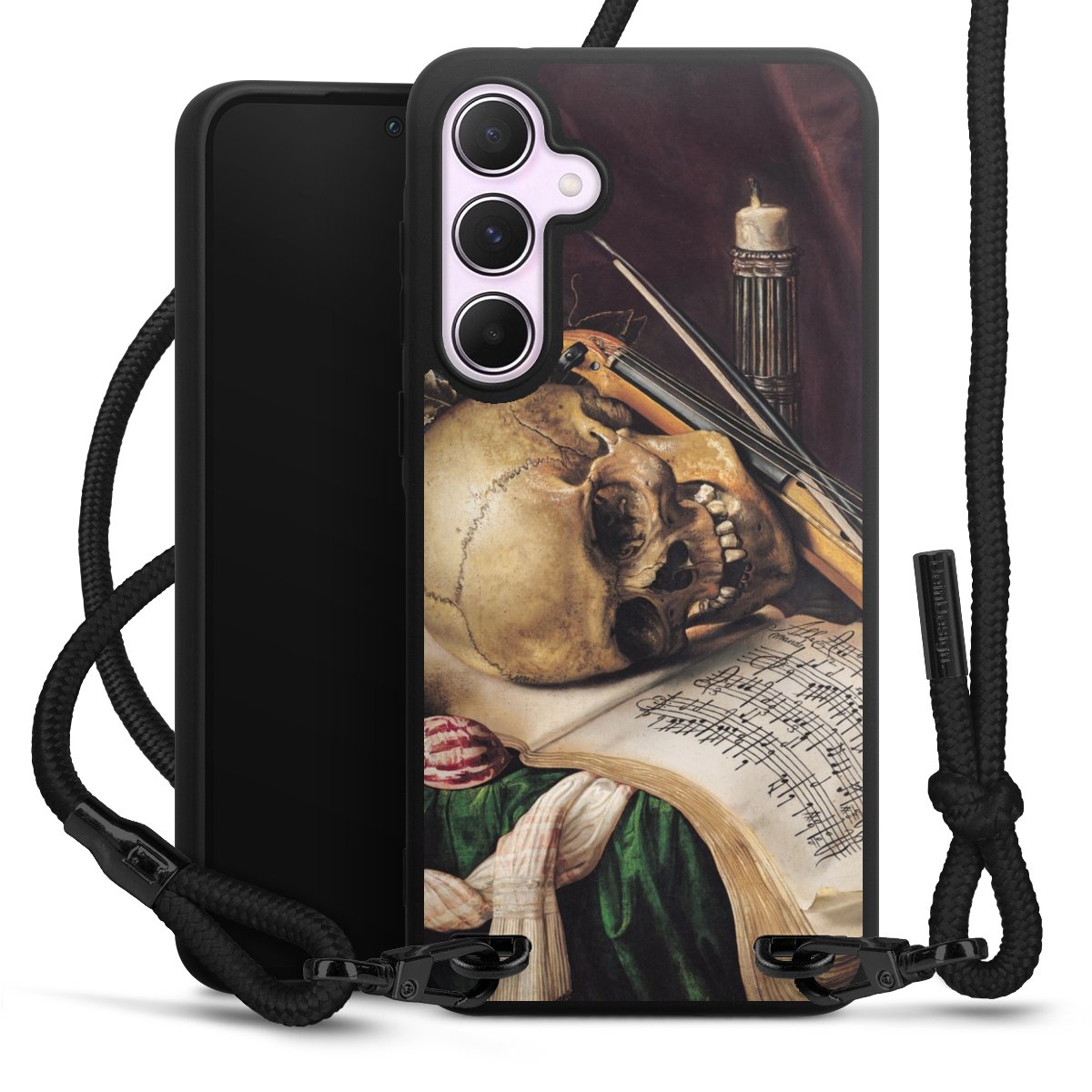 The matt black silicone case is made of flexible TPU (thermoplastic polyurethane) and offers robust protection. The durable, unbreakable material makes the cover flexible and dimensionally stable at the same time. The matte surface makes your design stand out more and is less susceptible to fingerprints and dirt. The stylish trend accessory fits comfortably in the hand and is perfectly complemented by the fabric (polyester) mobile phone strap. The braided fabric strap is approx. 1.70 metres long with a diameter of approx. 0.5 cm. Due to the special knotting technique, the length of the strap can be adjusted by simply pulling it, so that you can adapt it individually to your wishes. The practical case to wear around your neck is available with the fabric strap in black. As a little icing on the cake, we have provided the strap with a chic metal fastener in matt black. The strap is securely fastened to the case with loops made of high-quality genuine leather and press studs. The ends of the fabric strap are covered with metallic end caps and thus protected from fraying.