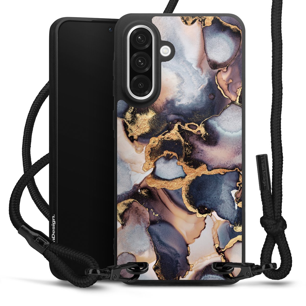 The matt black silicone case is made of flexible TPU (thermoplastic polyurethane) and offers robust protection. The durable, unbreakable material makes the cover flexible and dimensionally stable at the same time. The matte surface makes your design stand out more and is less susceptible to fingerprints and dirt. The stylish trend accessory fits comfortably in the hand and is perfectly complemented by the fabric (polyester) mobile phone strap. The braided fabric strap is approx. 1.70 metres long with a diameter of approx. 0.5 cm. Due to the special knotting technique, the length of the strap can be adjusted by simply pulling it, so that you can adapt it individually to your wishes. The practical case to wear around your neck is available with the fabric strap in black. As a little icing on the cake, we have provided the strap with a chic metal fastener in matt black. The strap is securely fastened to the case with loops made of high-quality genuine leather and press studs. The ends of the fabric strap are covered with metallic end caps and thus protected from fraying.
