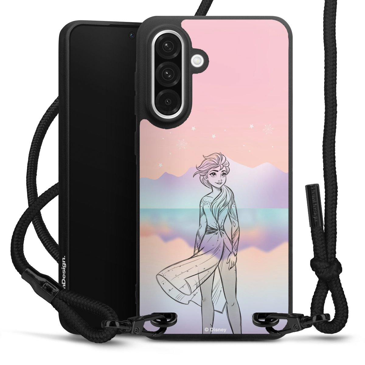 The matt black silicone case is made of flexible TPU (thermoplastic polyurethane) and offers robust protection. The durable, unbreakable material makes the cover flexible and dimensionally stable at the same time. The matte surface makes your design stand out more and is less susceptible to fingerprints and dirt. The stylish trend accessory fits comfortably in the hand and is perfectly complemented by the fabric (polyester) mobile phone strap. The braided fabric strap is approx. 1.70 metres long with a diameter of approx. 0.5 cm. Due to the special knotting technique, the length of the strap can be adjusted by simply pulling it, so that you can adapt it individually to your wishes. The practical case to wear around your neck is available with the fabric strap in black. As a little icing on the cake, we have provided the strap with a chic metal fastener in matt black. The strap is securely fastened to the case with loops made of high-quality genuine leather and press studs. The ends of the fabric strap are covered with metallic end caps and thus protected from fraying.
