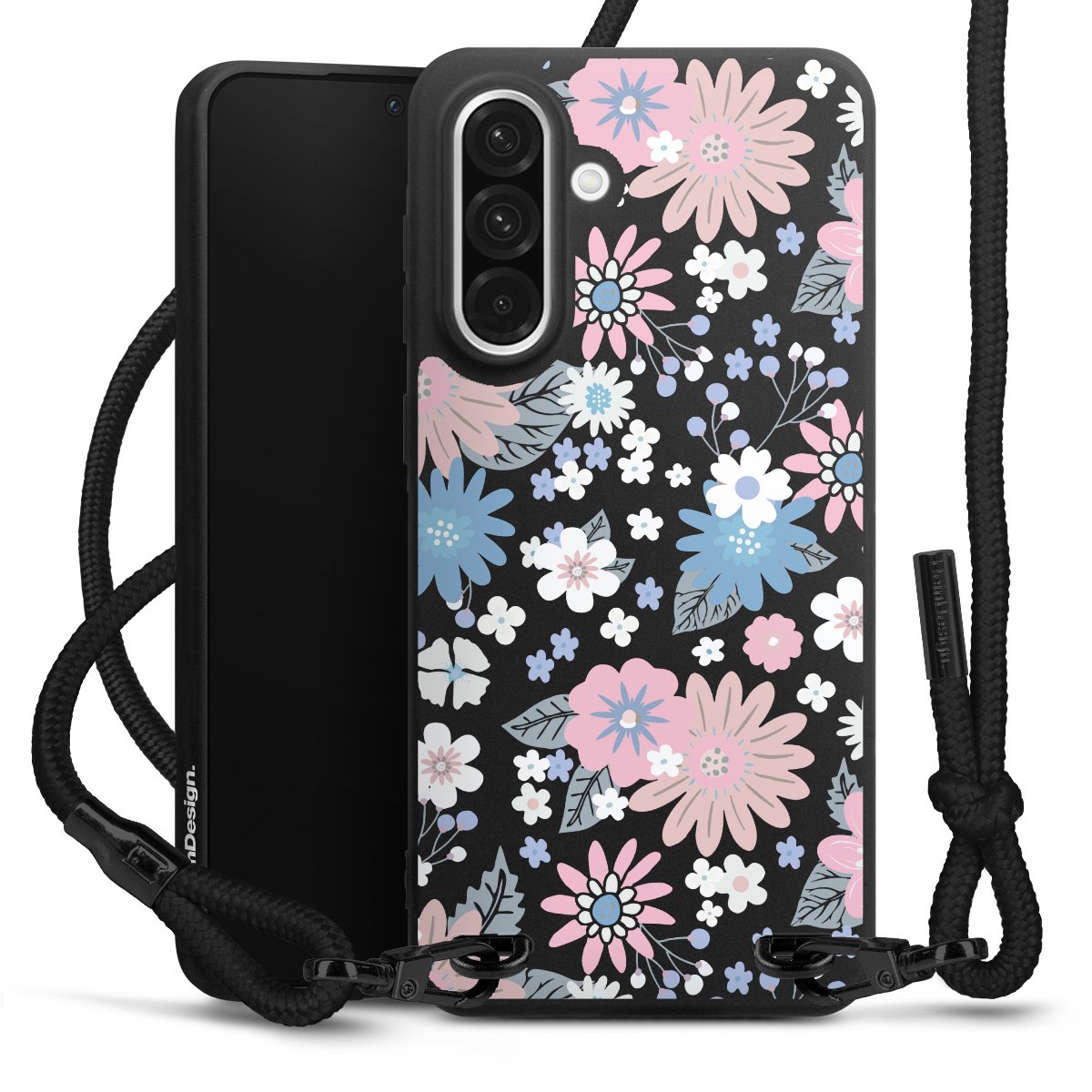 The matt black silicone case is made of flexible TPU (thermoplastic polyurethane) and offers robust protection. The durable, unbreakable material makes the cover flexible and dimensionally stable at the same time. The matte surface makes your design stand out more and is less susceptible to fingerprints and dirt. The stylish trend accessory fits comfortably in the hand and is perfectly complemented by the fabric (polyester) mobile phone strap. The braided fabric strap is approx. 1.70 metres long with a diameter of approx. 0.5 cm. Due to the special knotting technique, the length of the strap can be adjusted by simply pulling it, so that you can adapt it individually to your wishes. The practical case to wear around your neck is available with the fabric strap in black. As a little icing on the cake, we have provided the strap with a chic metal fastener in matt black. The strap is securely fastened to the case with loops made of high-quality genuine leather and press studs. The ends of the fabric strap are covered with metallic end caps and thus protected from fraying.