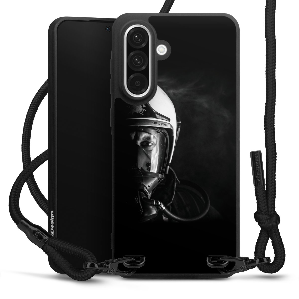 The matt black silicone case is made of flexible TPU (thermoplastic polyurethane) and offers robust protection. The durable, unbreakable material makes the cover flexible and dimensionally stable at the same time. The matte surface makes your design stand out more and is less susceptible to fingerprints and dirt. The stylish trend accessory fits comfortably in the hand and is perfectly complemented by the fabric (polyester) mobile phone strap. The braided fabric strap is approx. 1.70 metres long with a diameter of approx. 0.5 cm. Due to the special knotting technique, the length of the strap can be adjusted by simply pulling it, so that you can adapt it individually to your wishes. The practical case to wear around your neck is available with the fabric strap in black. As a little icing on the cake, we have provided the strap with a chic metal fastener in matt black. The strap is securely fastened to the case with loops made of high-quality genuine leather and press studs. The ends of the fabric strap are covered with metallic end caps and thus protected from fraying.