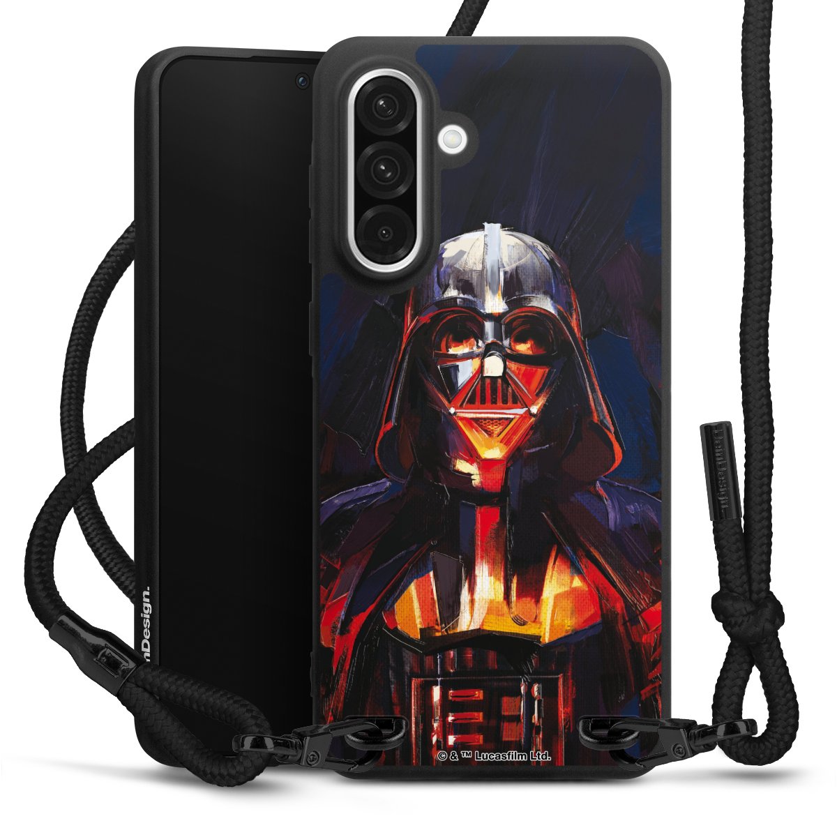 The matt black silicone case is made of flexible TPU (thermoplastic polyurethane) and offers robust protection. The durable, unbreakable material makes the cover flexible and dimensionally stable at the same time. The matte surface makes your design stand out more and is less susceptible to fingerprints and dirt. The stylish trend accessory fits comfortably in the hand and is perfectly complemented by the fabric (polyester) mobile phone strap. The braided fabric strap is approx. 1.70 metres long with a diameter of approx. 0.5 cm. Due to the special knotting technique, the length of the strap can be adjusted by simply pulling it, so that you can adapt it individually to your wishes. The practical case to wear around your neck is available with the fabric strap in black. As a little icing on the cake, we have provided the strap with a chic metal fastener in matt black. The strap is securely fastened to the case with loops made of high-quality genuine leather and press studs. The ends of the fabric strap are covered with metallic end caps and thus protected from fraying.