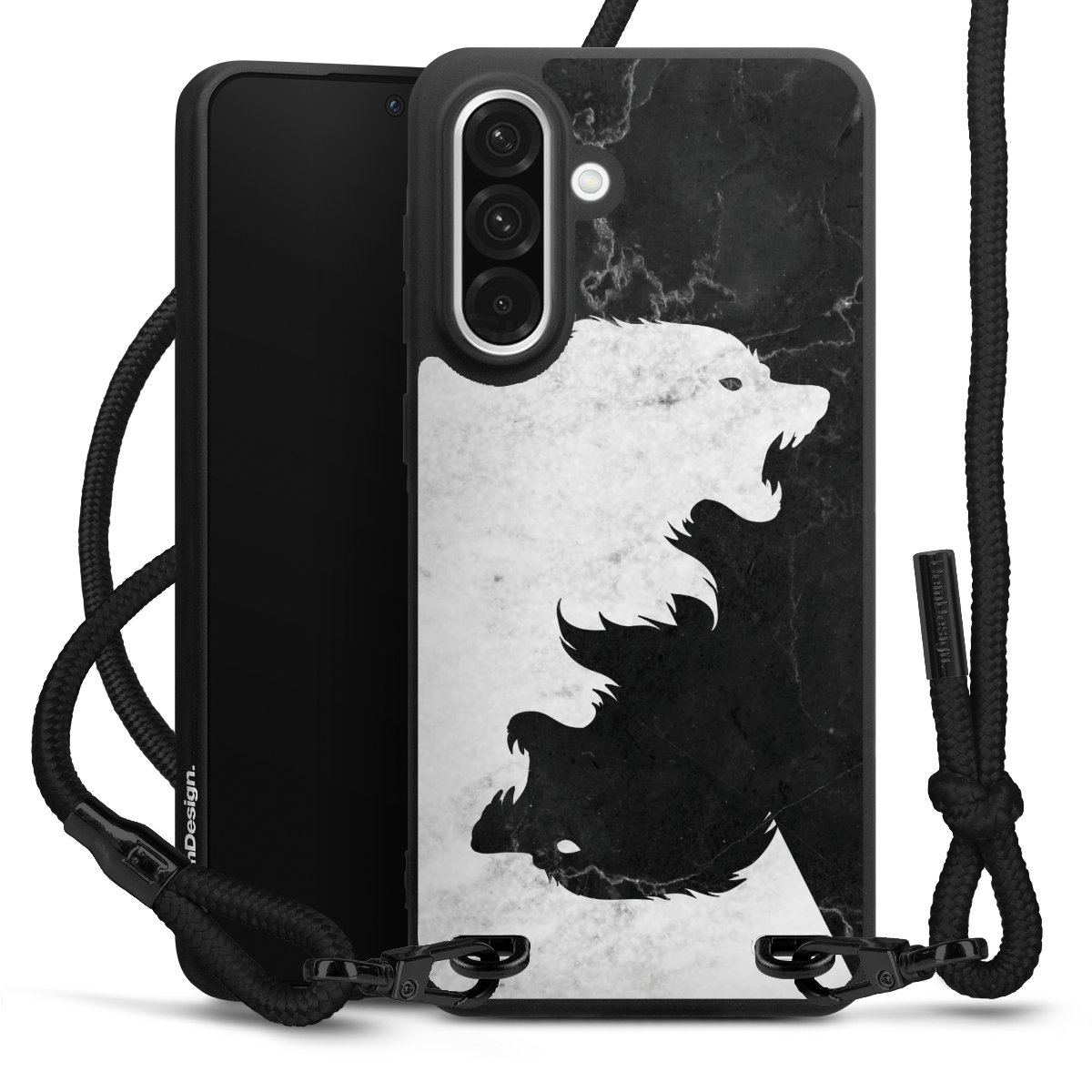 The matt black silicone case is made of flexible TPU (thermoplastic polyurethane) and offers robust protection. The durable, unbreakable material makes the cover flexible and dimensionally stable at the same time. The matte surface makes your design stand out more and is less susceptible to fingerprints and dirt. The stylish trend accessory fits comfortably in the hand and is perfectly complemented by the fabric (polyester) mobile phone strap. The braided fabric strap is approx. 1.70 metres long with a diameter of approx. 0.5 cm. Due to the special knotting technique, the length of the strap can be adjusted by simply pulling it, so that you can adapt it individually to your wishes. The practical case to wear around your neck is available with the fabric strap in black. As a little icing on the cake, we have provided the strap with a chic metal fastener in matt black. The strap is securely fastened to the case with loops made of high-quality genuine leather and press studs. The ends of the fabric strap are covered with metallic end caps and thus protected from fraying.