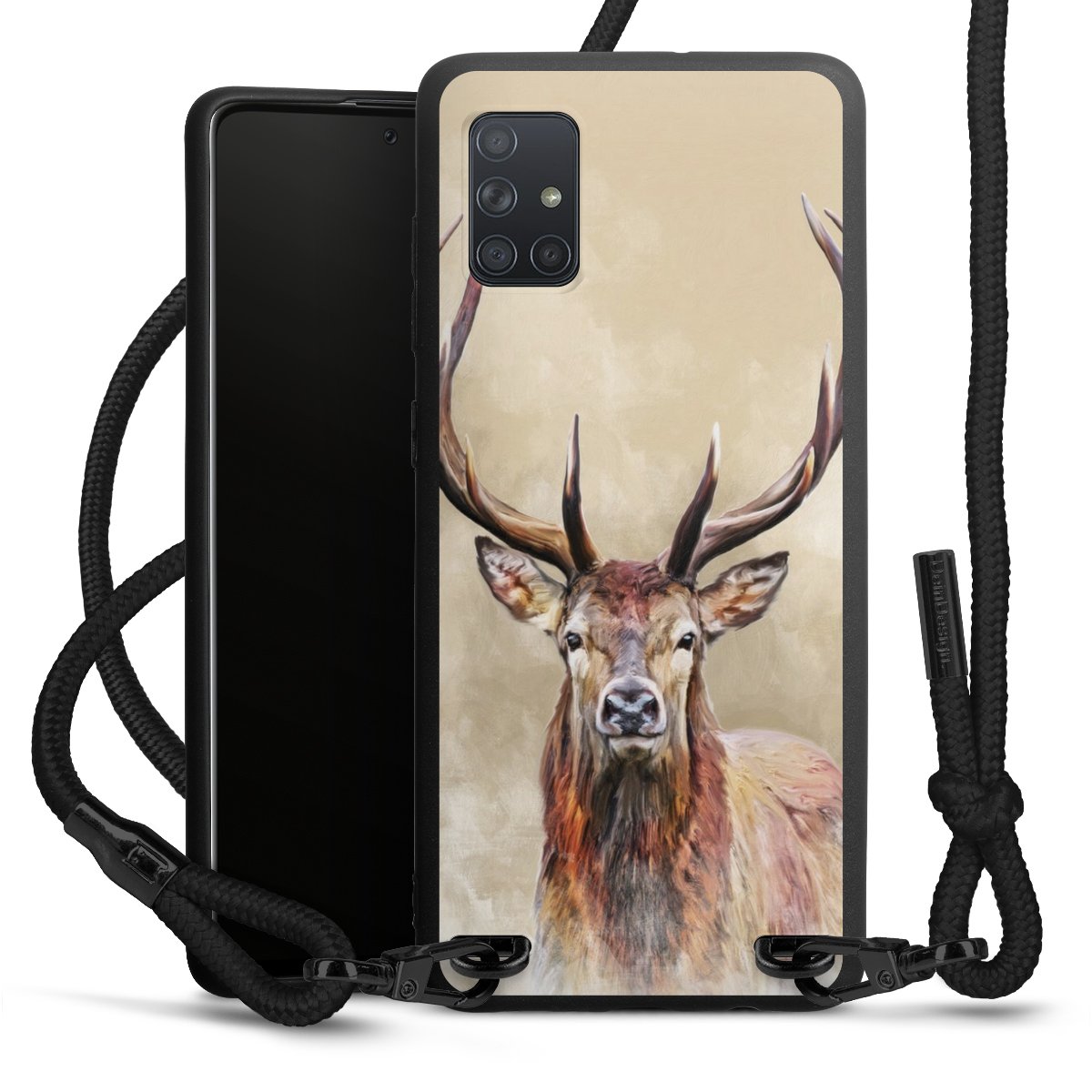 The matt black silicone case is made of flexible TPU (thermoplastic polyurethane) and offers robust protection. The durable, unbreakable material makes the cover flexible and dimensionally stable at the same time. The matte surface makes your design stand out more and is less susceptible to fingerprints and dirt. The stylish trend accessory fits comfortably in the hand and is perfectly complemented by the fabric (polyester) mobile phone strap. The braided fabric strap is approx. 1.70 metres long with a diameter of approx. 0.5 cm. Due to the special knotting technique, the length of the strap can be adjusted by simply pulling it, so that you can adapt it individually to your wishes. The practical case to wear around your neck is available with the fabric strap in black. As a little icing on the cake, we have provided the strap with a chic metal fastener in matt black. The strap is securely fastened to the case with loops made of high-quality genuine leather and press studs. The ends of the fabric strap are covered with metallic end caps and thus protected from fraying.