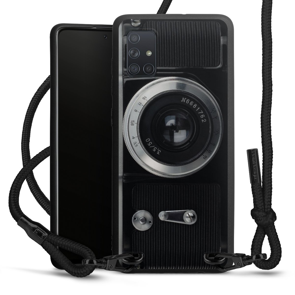 The matt black silicone case is made of flexible TPU (thermoplastic polyurethane) and offers robust protection. The durable, unbreakable material makes the cover flexible and dimensionally stable at the same time. The matte surface makes your design stand out more and is less susceptible to fingerprints and dirt. The stylish trend accessory fits comfortably in the hand and is perfectly complemented by the fabric (polyester) mobile phone strap. The braided fabric strap is approx. 1.70 metres long with a diameter of approx. 0.5 cm. Due to the special knotting technique, the length of the strap can be adjusted by simply pulling it, so that you can adapt it individually to your wishes. The practical case to wear around your neck is available with the fabric strap in black. As a little icing on the cake, we have provided the strap with a chic metal fastener in matt black. The strap is securely fastened to the case with loops made of high-quality genuine leather and press studs. The ends of the fabric strap are covered with metallic end caps and thus protected from fraying.