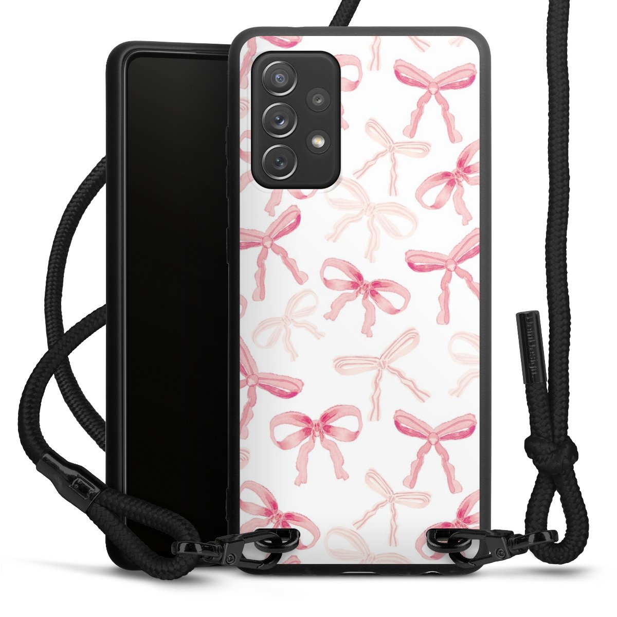 The matt black silicone case is made of flexible TPU (thermoplastic polyurethane) and offers robust protection. The durable, unbreakable material makes the cover flexible and dimensionally stable at the same time. The matte surface makes your design stand out more and is less susceptible to fingerprints and dirt. The stylish trend accessory fits comfortably in the hand and is perfectly complemented by the fabric (polyester) mobile phone strap. The braided fabric strap is approx. 1.70 metres long with a diameter of approx. 0.5 cm. Due to the special knotting technique, the length of the strap can be adjusted by simply pulling it, so that you can adapt it individually to your wishes. The practical case to wear around your neck is available with the fabric strap in black. As a little icing on the cake, we have provided the strap with a chic metal fastener in matt black. The strap is securely fastened to the case with loops made of high-quality genuine leather and press studs. The ends of the fabric strap are covered with metallic end caps and thus protected from fraying.