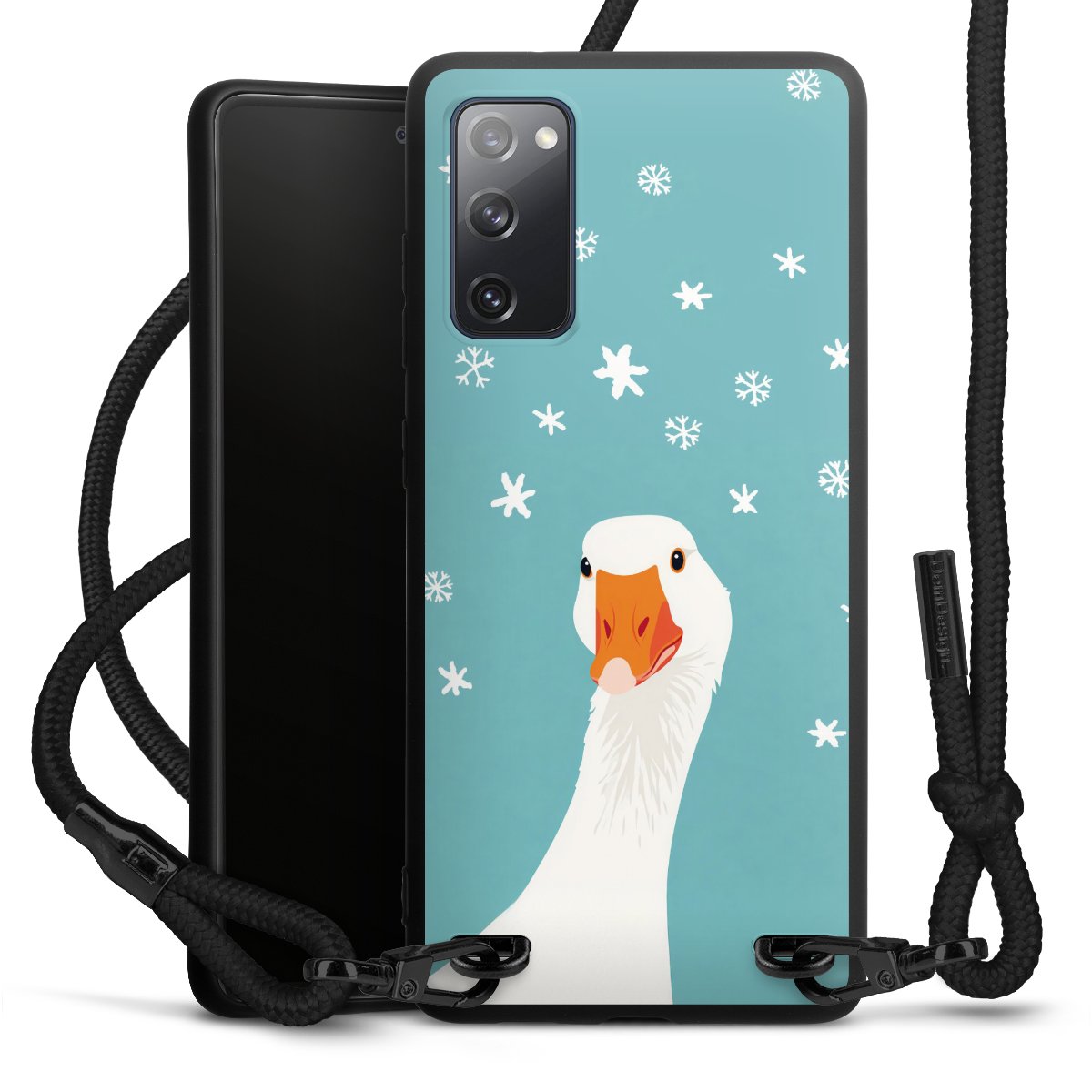 The matt black silicone case is made of flexible TPU (thermoplastic polyurethane) and offers robust protection. The durable, unbreakable material makes the cover flexible and dimensionally stable at the same time. The matte surface makes your design stand out more and is less susceptible to fingerprints and dirt. The stylish trend accessory fits comfortably in the hand and is perfectly complemented by the fabric (polyester) mobile phone strap. The braided fabric strap is approx. 1.70 metres long with a diameter of approx. 0.5 cm. Due to the special knotting technique, the length of the strap can be adjusted by simply pulling it, so that you can adapt it individually to your wishes. The practical case to wear around your neck is available with the fabric strap in black. As a little icing on the cake, we have provided the strap with a chic metal fastener in matt black. The strap is securely fastened to the case with loops made of high-quality genuine leather and press studs. The ends of the fabric strap are covered with metallic end caps and thus protected from fraying.