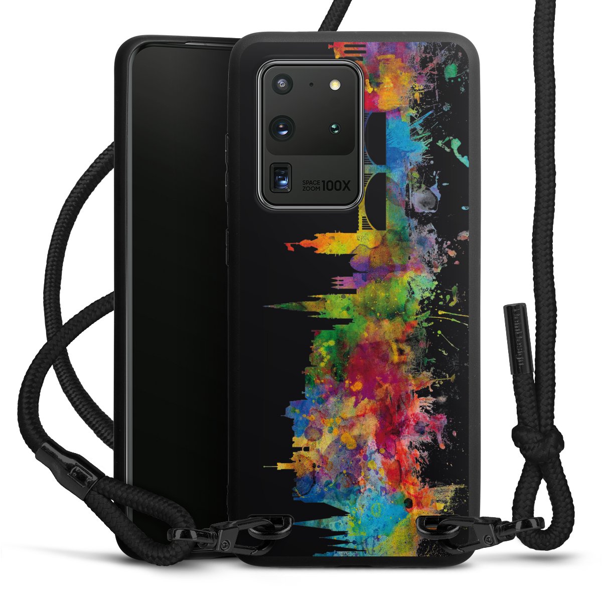 We use the solid direct print process for this phone case, which is why the print area only covers the back and the edge remains unprinted. The case to wear around your neck can be ordered unprinted, fully printed, or partially printed. For your design, either choose one of our exclusive shop motifs or get creative and create your own design, for example with photos and overlays. Design your own personal trend accessory and make an individual statement on the streets!