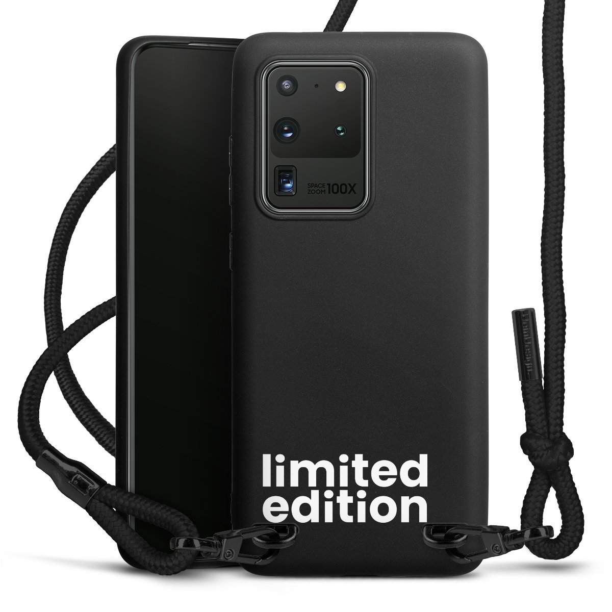 The matt black silicone case is made of flexible TPU (thermoplastic polyurethane) and offers robust protection. The durable, unbreakable material makes the cover flexible and dimensionally stable at the same time. The matte surface makes your design stand out more and is less susceptible to fingerprints and dirt. The stylish trend accessory fits comfortably in the hand and is perfectly complemented by the fabric (polyester) mobile phone strap. The braided fabric strap is approx. 1.70 metres long with a diameter of approx. 0.5 cm. Due to the special knotting technique, the length of the strap can be adjusted by simply pulling it, so that you can adapt it individually to your wishes. The practical case to wear around your neck is available with the fabric strap in black. As a little icing on the cake, we have provided the strap with a chic metal fastener in matt black. The strap is securely fastened to the case with loops made of high-quality genuine leather and press studs. The ends of the fabric strap are covered with metallic end caps and thus protected from fraying.