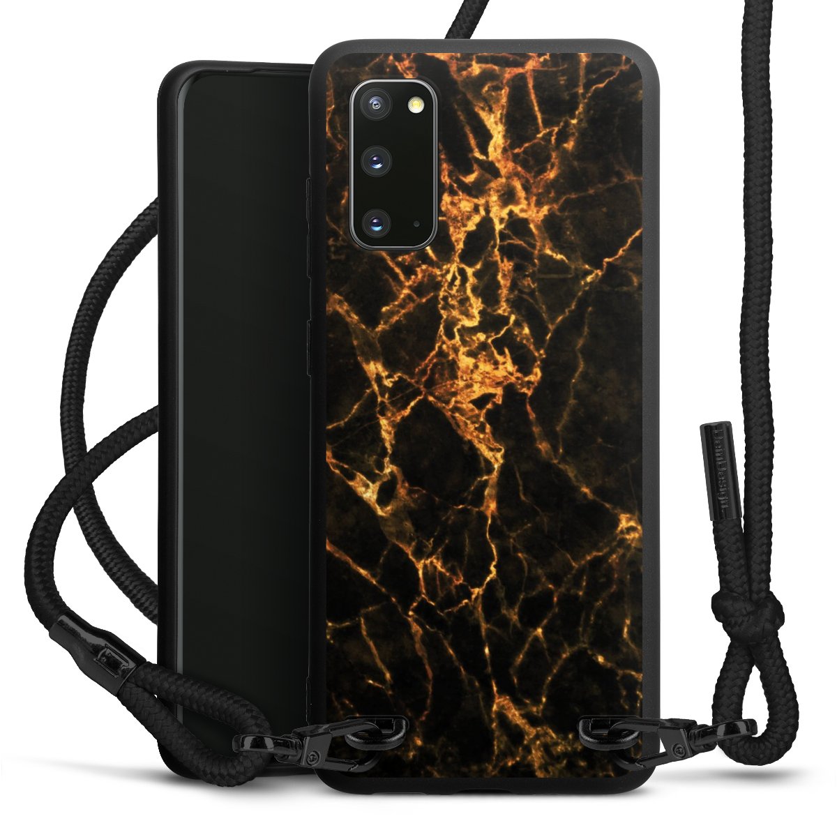 The matt black silicone case is made of flexible TPU (thermoplastic polyurethane) and offers robust protection. The durable, unbreakable material makes the cover flexible and dimensionally stable at the same time. The matte surface makes your design stand out more and is less susceptible to fingerprints and dirt. The stylish trend accessory fits comfortably in the hand and is perfectly complemented by the fabric (polyester) mobile phone strap. The braided fabric strap is approx. 1.70 metres long with a diameter of approx. 0.5 cm. Due to the special knotting technique, the length of the strap can be adjusted by simply pulling it, so that you can adapt it individually to your wishes. The practical case to wear around your neck is available with the fabric strap in black. As a little icing on the cake, we have provided the strap with a chic metal fastener in matt black. The strap is securely fastened to the case with loops made of high-quality genuine leather and press studs. The ends of the fabric strap are covered with metallic end caps and thus protected from fraying.
