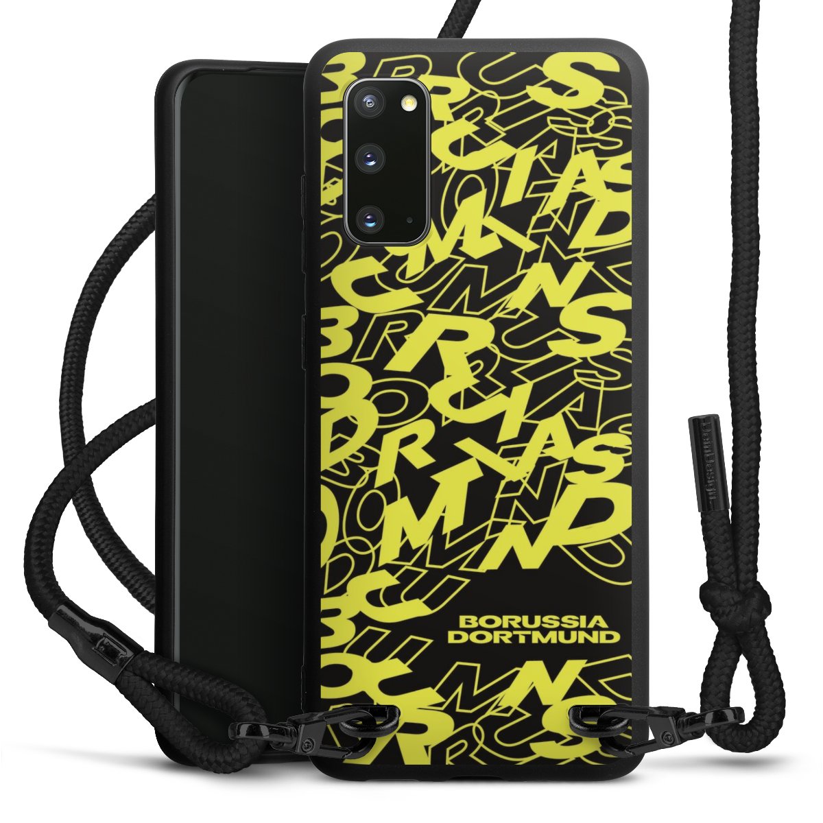 The matt black silicone case is made of flexible TPU (thermoplastic polyurethane) and offers robust protection. The durable, unbreakable material makes the cover flexible and dimensionally stable at the same time. The matte surface makes your design stand out more and is less susceptible to fingerprints and dirt. The stylish trend accessory fits comfortably in the hand and is perfectly complemented by the fabric (polyester) mobile phone strap. The braided fabric strap is approx. 1.70 metres long with a diameter of approx. 0.5 cm. Due to the special knotting technique, the length of the strap can be adjusted by simply pulling it, so that you can adapt it individually to your wishes. The practical case to wear around your neck is available with the fabric strap in black. As a little icing on the cake, we have provided the strap with a chic metal fastener in matt black. The strap is securely fastened to the case with loops made of high-quality genuine leather and press studs. The ends of the fabric strap are covered with metallic end caps and thus protected from fraying.