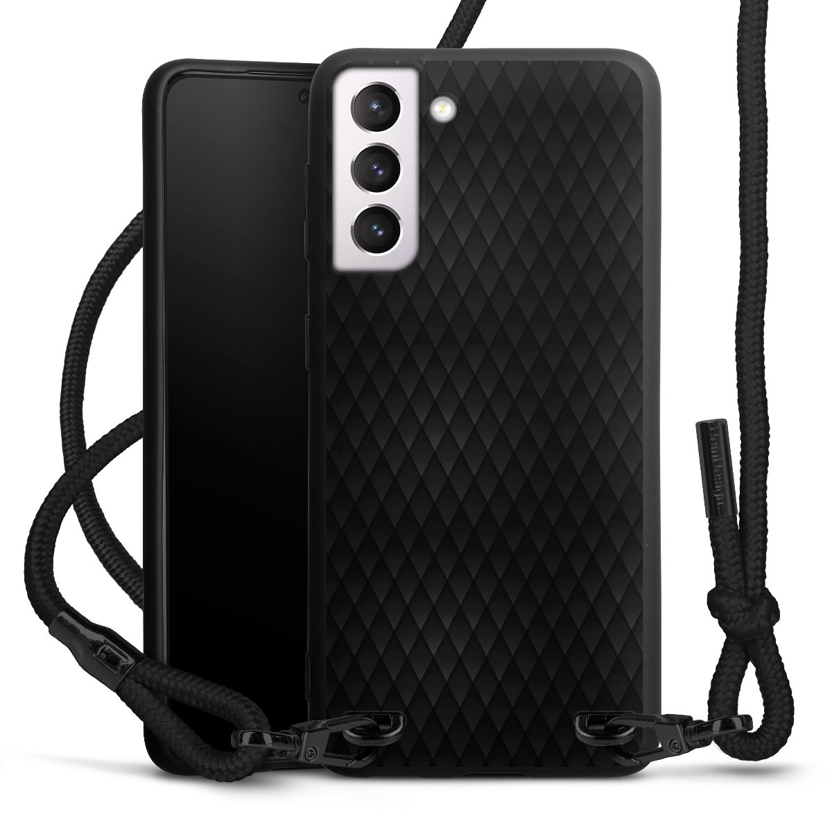 The matt black silicone case is made of flexible TPU (thermoplastic polyurethane) and offers robust protection. The durable, unbreakable material makes the cover flexible and dimensionally stable at the same time. The matte surface makes your design stand out more and is less susceptible to fingerprints and dirt. The stylish trend accessory fits comfortably in the hand and is perfectly complemented by the fabric (polyester) mobile phone strap. The braided fabric strap is approx. 1.70 metres long with a diameter of approx. 0.5 cm. Due to the special knotting technique, the length of the strap can be adjusted by simply pulling it, so that you can adapt it individually to your wishes. The practical case to wear around your neck is available with the fabric strap in black. As a little icing on the cake, we have provided the strap with a chic metal fastener in matt black. The strap is securely fastened to the case with loops made of high-quality genuine leather and press studs. The ends of the fabric strap are covered with metallic end caps and thus protected from fraying.