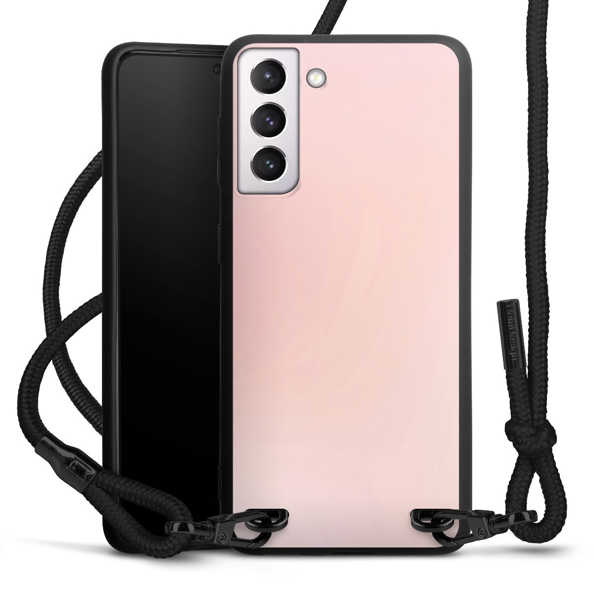 The matt black silicone case is made of flexible TPU (thermoplastic polyurethane) and offers robust protection. The durable, unbreakable material makes the cover flexible and dimensionally stable at the same time. The matte surface makes your design stand out more and is less susceptible to fingerprints and dirt. The stylish trend accessory fits comfortably in the hand and is perfectly complemented by the fabric (polyester) mobile phone strap. The braided fabric strap is approx. 1.70 metres long with a diameter of approx. 0.5 cm. Due to the special knotting technique, the length of the strap can be adjusted by simply pulling it, so that you can adapt it individually to your wishes. The practical case to wear around your neck is available with the fabric strap in black. As a little icing on the cake, we have provided the strap with a chic metal fastener in matt black. The strap is securely fastened to the case with loops made of high-quality genuine leather and press studs. The ends of the fabric strap are covered with metallic end caps and thus protected from fraying.