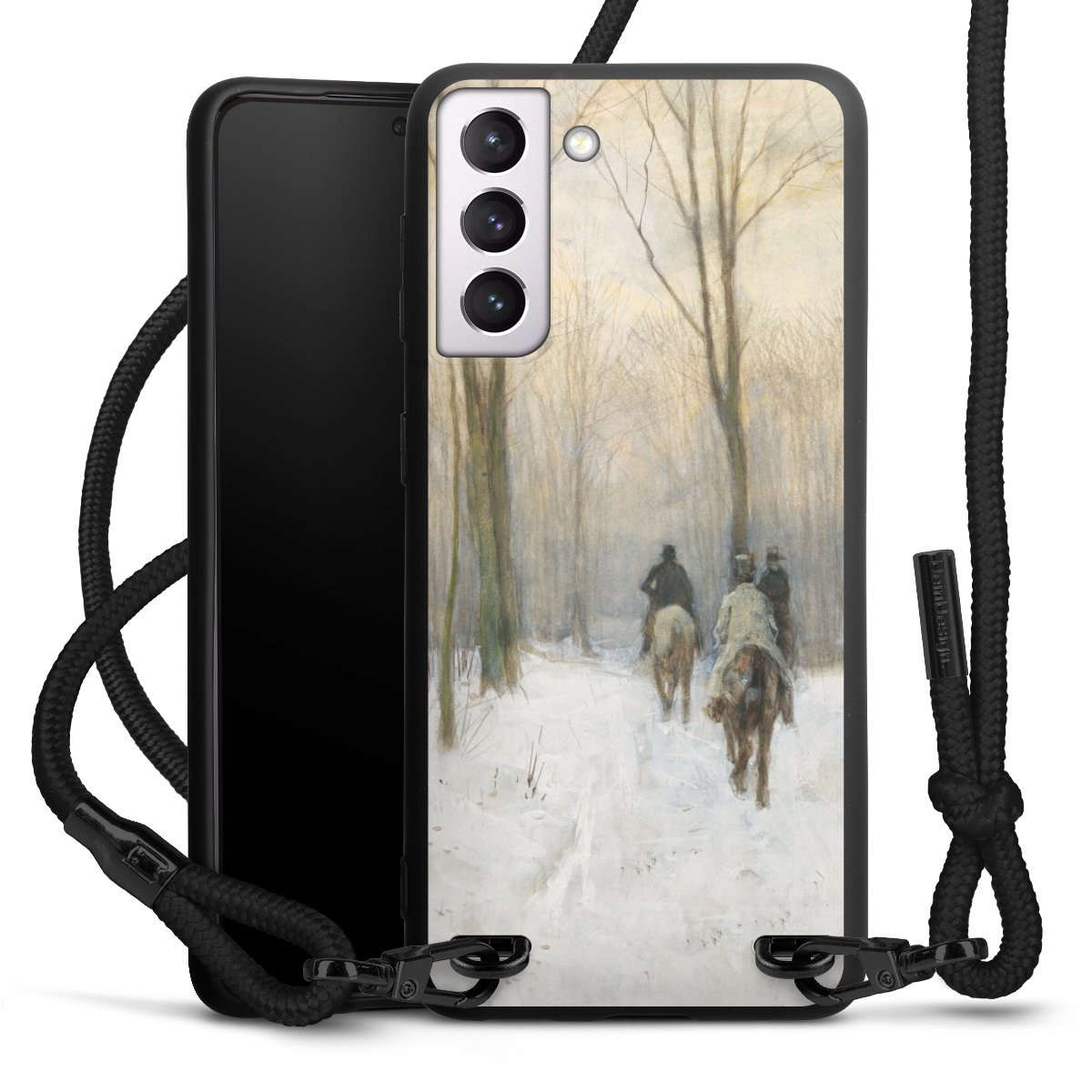 The matt black silicone case is made of flexible TPU (thermoplastic polyurethane) and offers robust protection. The durable, unbreakable material makes the cover flexible and dimensionally stable at the same time. The matte surface makes your design stand out more and is less susceptible to fingerprints and dirt. The stylish trend accessory fits comfortably in the hand and is perfectly complemented by the fabric (polyester) mobile phone strap. The braided fabric strap is approx. 1.70 metres long with a diameter of approx. 0.5 cm. Due to the special knotting technique, the length of the strap can be adjusted by simply pulling it, so that you can adapt it individually to your wishes. The practical case to wear around your neck is available with the fabric strap in black. As a little icing on the cake, we have provided the strap with a chic metal fastener in matt black. The strap is securely fastened to the case with loops made of high-quality genuine leather and press studs. The ends of the fabric strap are covered with metallic end caps and thus protected from fraying.