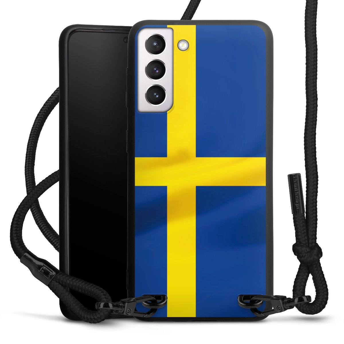 The matt black silicone case is made of flexible TPU (thermoplastic polyurethane) and offers robust protection. The durable, unbreakable material makes the cover flexible and dimensionally stable at the same time. The matte surface makes your design stand out more and is less susceptible to fingerprints and dirt. The stylish trend accessory fits comfortably in the hand and is perfectly complemented by the fabric (polyester) mobile phone strap. The braided fabric strap is approx. 1.70 metres long with a diameter of approx. 0.5 cm. Due to the special knotting technique, the length of the strap can be adjusted by simply pulling it, so that you can adapt it individually to your wishes. The practical case to wear around your neck is available with the fabric strap in black. As a little icing on the cake, we have provided the strap with a chic metal fastener in matt black. The strap is securely fastened to the case with loops made of high-quality genuine leather and press studs. The ends of the fabric strap are covered with metallic end caps and thus protected from fraying.