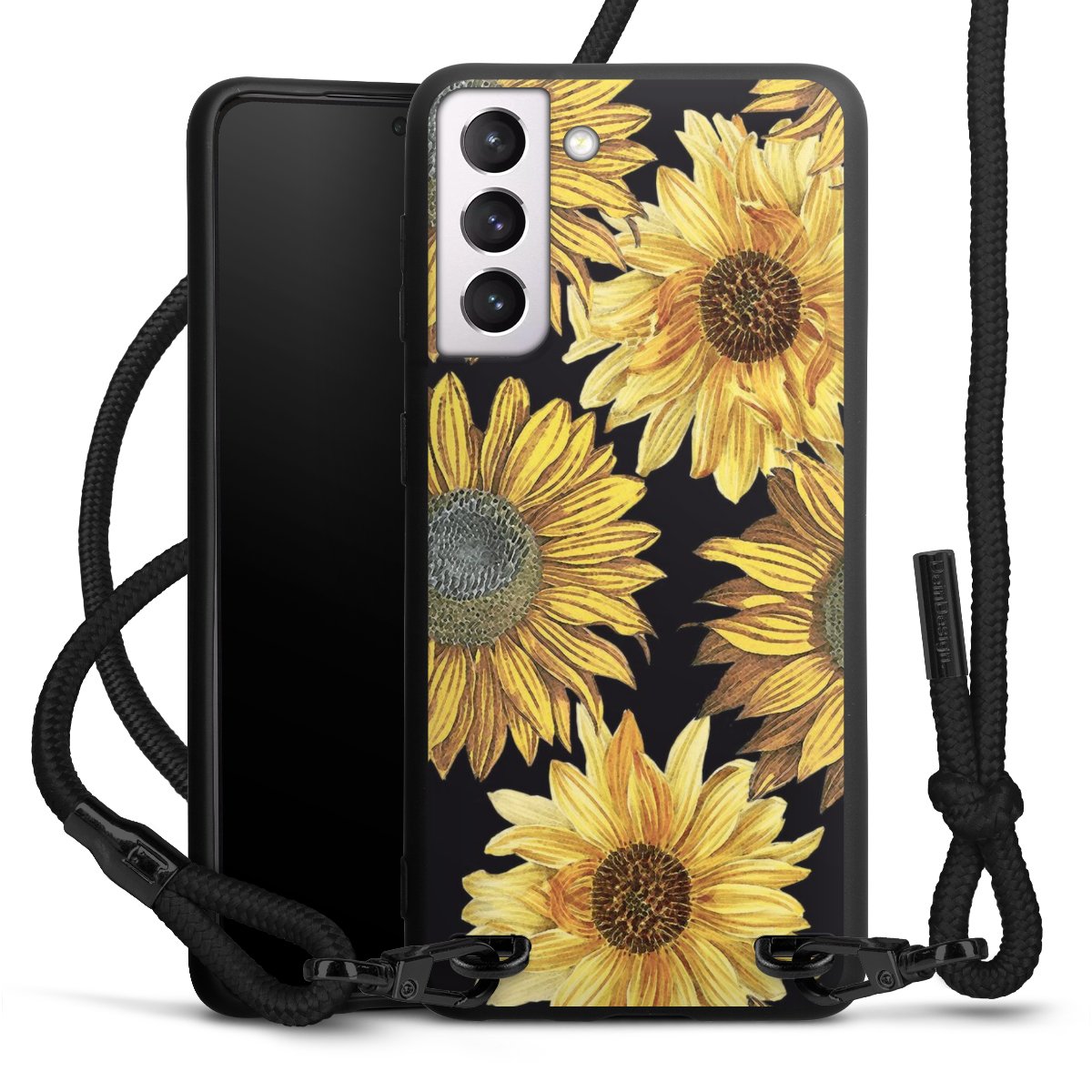 The matt black silicone case is made of flexible TPU (thermoplastic polyurethane) and offers robust protection. The durable, unbreakable material makes the cover flexible and dimensionally stable at the same time. The matte surface makes your design stand out more and is less susceptible to fingerprints and dirt. The stylish trend accessory fits comfortably in the hand and is perfectly complemented by the fabric (polyester) mobile phone strap. The braided fabric strap is approx. 1.70 metres long with a diameter of approx. 0.5 cm. Due to the special knotting technique, the length of the strap can be adjusted by simply pulling it, so that you can adapt it individually to your wishes. The practical case to wear around your neck is available with the fabric strap in black. As a little icing on the cake, we have provided the strap with a chic metal fastener in matt black. The strap is securely fastened to the case with loops made of high-quality genuine leather and press studs. The ends of the fabric strap are covered with metallic end caps and thus protected from fraying.