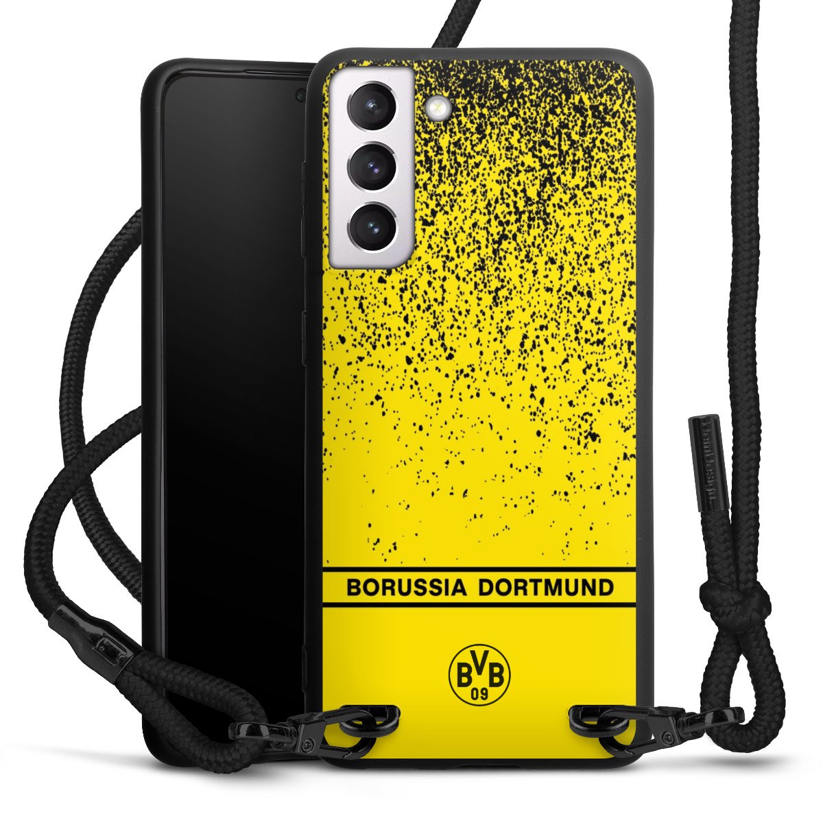 The matt black silicone case is made of flexible TPU (thermoplastic polyurethane) and offers robust protection. The durable, unbreakable material makes the cover flexible and dimensionally stable at the same time. The matte surface makes your design stand out more and is less susceptible to fingerprints and dirt. The stylish trend accessory fits comfortably in the hand and is perfectly complemented by the fabric (polyester) mobile phone strap. The braided fabric strap is approx. 1.70 metres long with a diameter of approx. 0.5 cm. Due to the special knotting technique, the length of the strap can be adjusted by simply pulling it, so that you can adapt it individually to your wishes. The practical case to wear around your neck is available with the fabric strap in black. As a little icing on the cake, we have provided the strap with a chic metal fastener in matt black. The strap is securely fastened to the case with loops made of high-quality genuine leather and press studs. The ends of the fabric strap are covered with metallic end caps and thus protected from fraying.