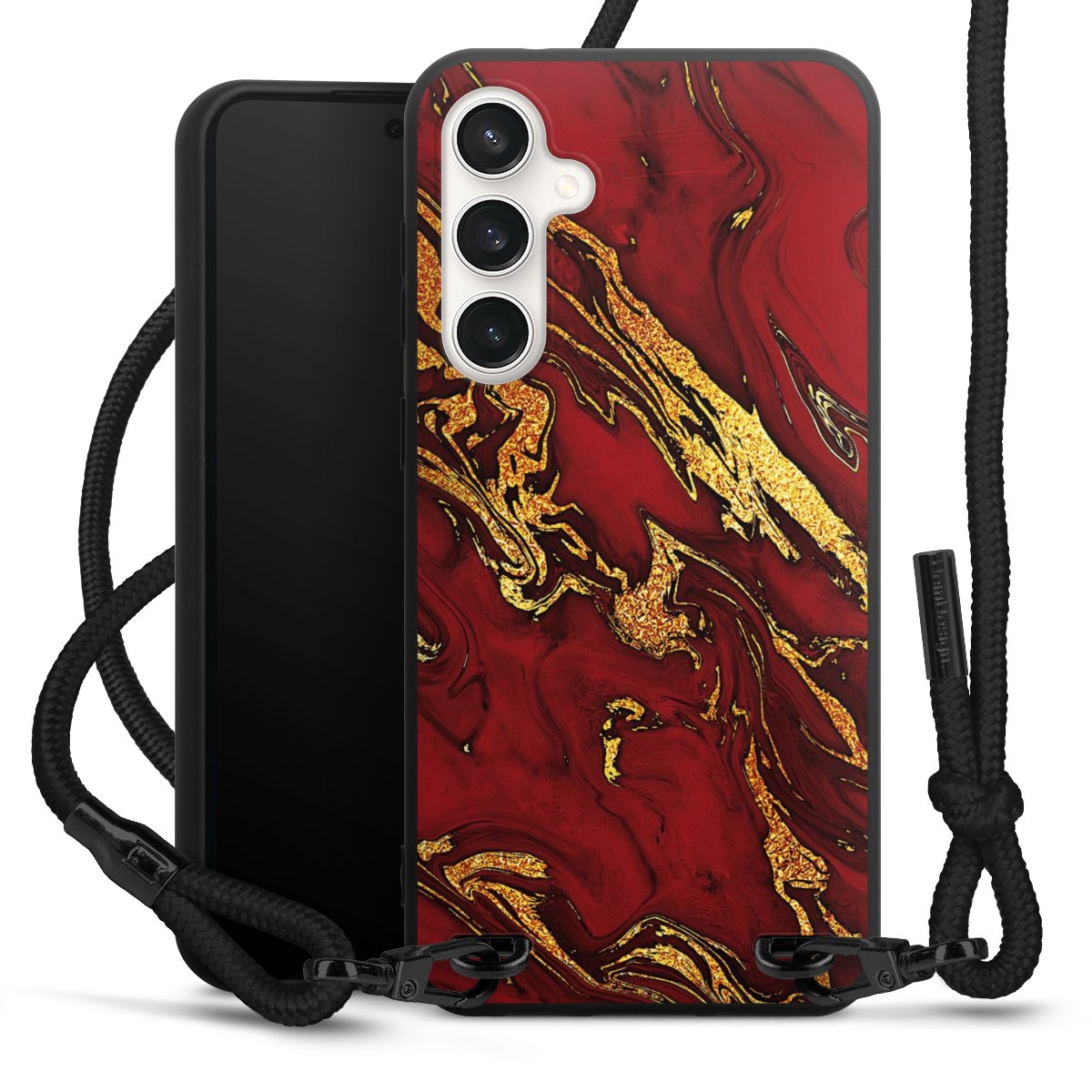 The matt black silicone case is made of flexible TPU (thermoplastic polyurethane) and offers robust protection. The durable, unbreakable material makes the cover flexible and dimensionally stable at the same time. The matte surface makes your design stand out more and is less susceptible to fingerprints and dirt. The stylish trend accessory fits comfortably in the hand and is perfectly complemented by the fabric (polyester) mobile phone strap. The braided fabric strap is approx. 1.70 metres long with a diameter of approx. 0.5 cm. Due to the special knotting technique, the length of the strap can be adjusted by simply pulling it, so that you can adapt it individually to your wishes. The practical case to wear around your neck is available with the fabric strap in black. As a little icing on the cake, we have provided the strap with a chic metal fastener in matt black. The strap is securely fastened to the case with loops made of high-quality genuine leather and press studs. The ends of the fabric strap are covered with metallic end caps and thus protected from fraying.