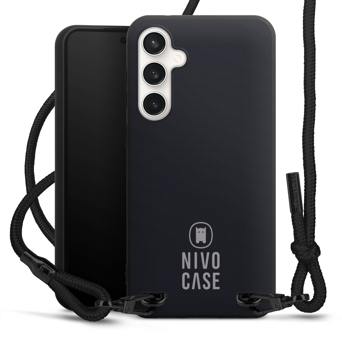 The matt black silicone case is made of flexible TPU (thermoplastic polyurethane) and offers robust protection. The durable, unbreakable material makes the cover flexible and dimensionally stable at the same time. The matte surface makes your design stand out more and is less susceptible to fingerprints and dirt. The stylish trend accessory fits comfortably in the hand and is perfectly complemented by the fabric (polyester) mobile phone strap. The braided fabric strap is approx. 1.70 metres long with a diameter of approx. 0.5 cm. Due to the special knotting technique, the length of the strap can be adjusted by simply pulling it, so that you can adapt it individually to your wishes. The practical case to wear around your neck is available with the fabric strap in black. As a little icing on the cake, we have provided the strap with a chic metal fastener in matt black. The strap is securely fastened to the case with loops made of high-quality genuine leather and press studs. The ends of the fabric strap are covered with metallic end caps and thus protected from fraying.