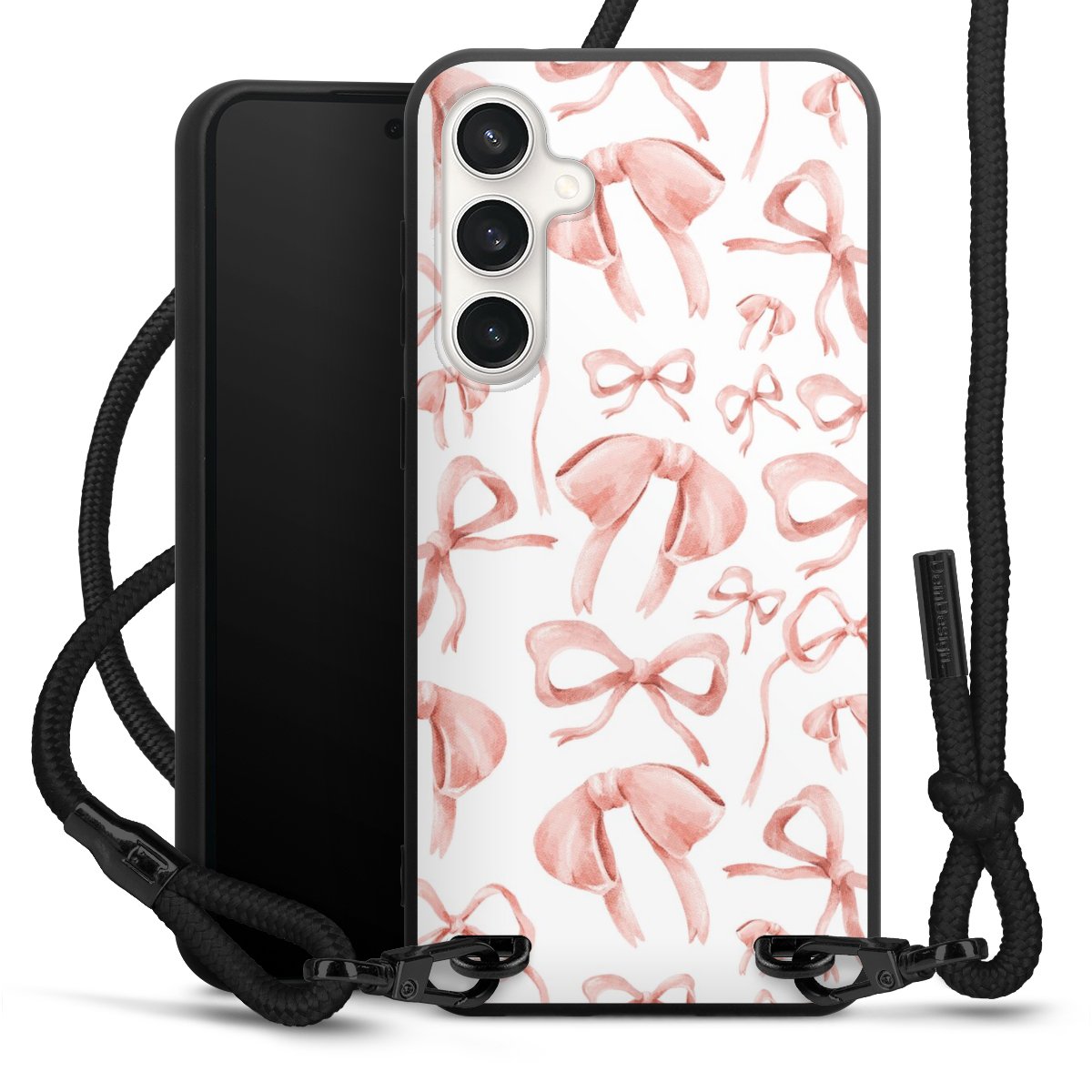 The matt black silicone case is made of flexible TPU (thermoplastic polyurethane) and offers robust protection. The durable, unbreakable material makes the cover flexible and dimensionally stable at the same time. The matte surface makes your design stand out more and is less susceptible to fingerprints and dirt. The stylish trend accessory fits comfortably in the hand and is perfectly complemented by the fabric (polyester) mobile phone strap. The braided fabric strap is approx. 1.70 metres long with a diameter of approx. 0.5 cm. Due to the special knotting technique, the length of the strap can be adjusted by simply pulling it, so that you can adapt it individually to your wishes. The practical case to wear around your neck is available with the fabric strap in black. As a little icing on the cake, we have provided the strap with a chic metal fastener in matt black. The strap is securely fastened to the case with loops made of high-quality genuine leather and press studs. The ends of the fabric strap are covered with metallic end caps and thus protected from fraying.