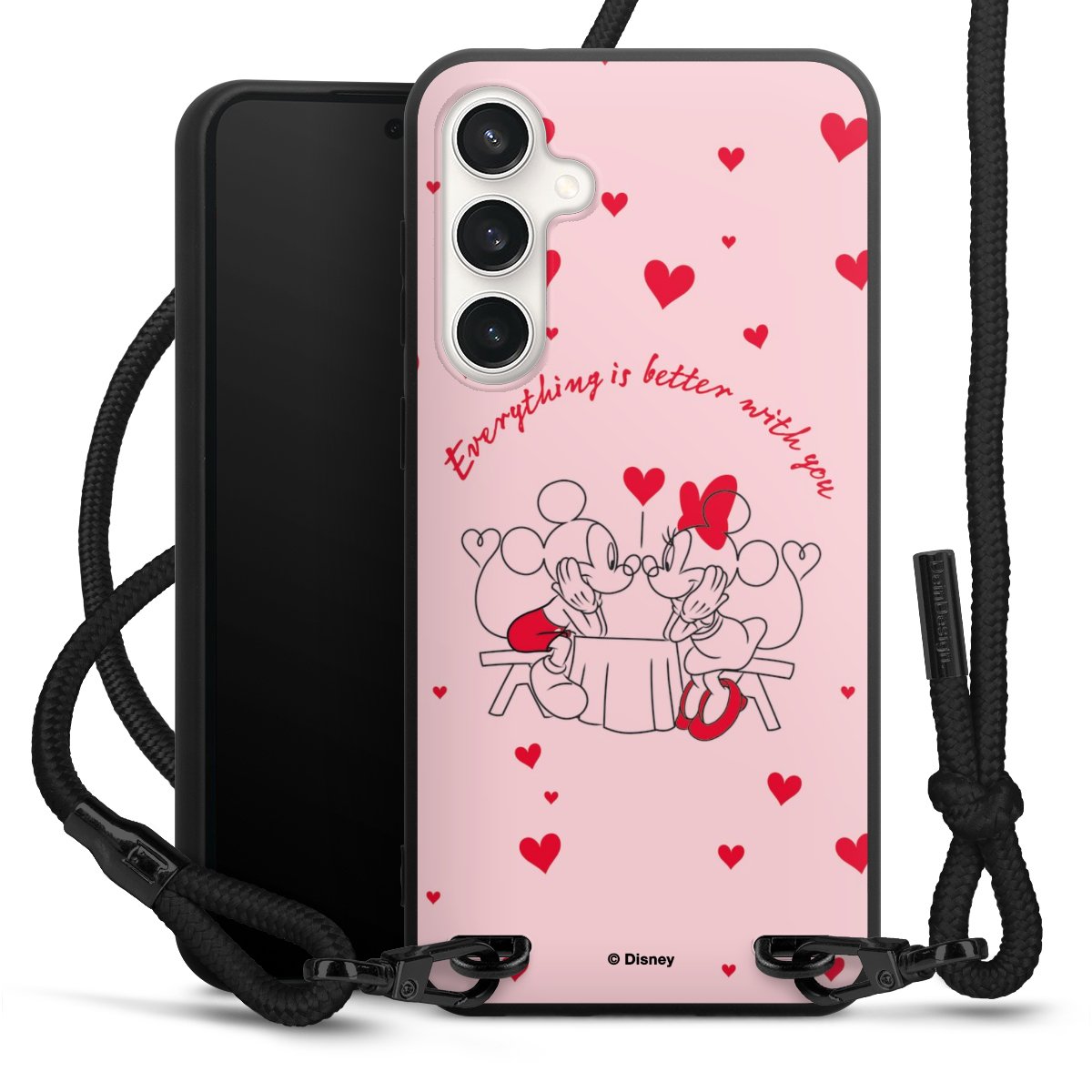 The matt black silicone case is made of flexible TPU (thermoplastic polyurethane) and offers robust protection. The durable, unbreakable material makes the cover flexible and dimensionally stable at the same time. The matte surface makes your design stand out more and is less susceptible to fingerprints and dirt. The stylish trend accessory fits comfortably in the hand and is perfectly complemented by the fabric (polyester) mobile phone strap. The braided fabric strap is approx. 1.70 metres long with a diameter of approx. 0.5 cm. Due to the special knotting technique, the length of the strap can be adjusted by simply pulling it, so that you can adapt it individually to your wishes. The practical case to wear around your neck is available with the fabric strap in black. As a little icing on the cake, we have provided the strap with a chic metal fastener in matt black. The strap is securely fastened to the case with loops made of high-quality genuine leather and press studs. The ends of the fabric strap are covered with metallic end caps and thus protected from fraying.
