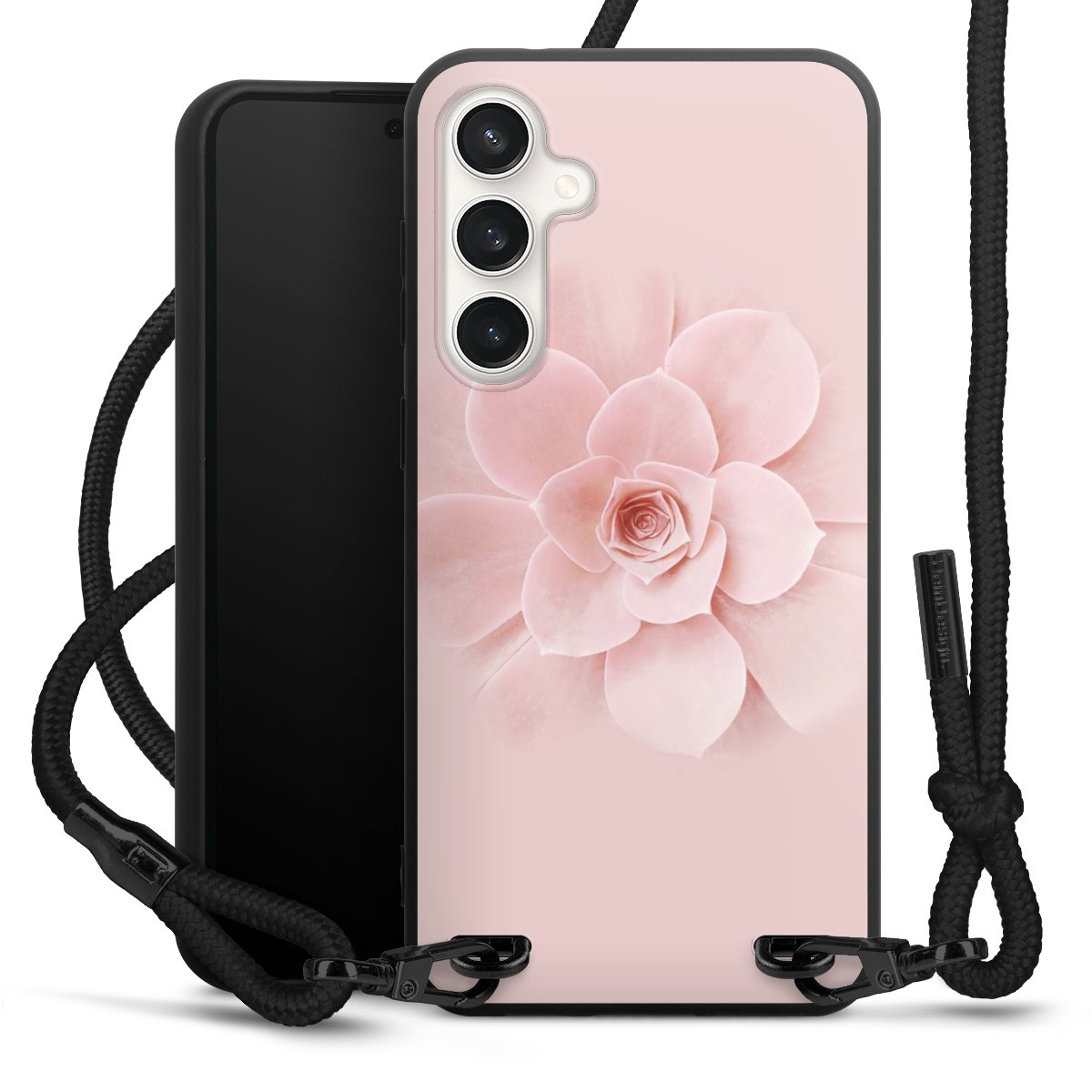The matt black silicone case is made of flexible TPU (thermoplastic polyurethane) and offers robust protection. The durable, unbreakable material makes the cover flexible and dimensionally stable at the same time. The matte surface makes your design stand out more and is less susceptible to fingerprints and dirt. The stylish trend accessory fits comfortably in the hand and is perfectly complemented by the fabric (polyester) mobile phone strap. The braided fabric strap is approx. 1.70 metres long with a diameter of approx. 0.5 cm. Due to the special knotting technique, the length of the strap can be adjusted by simply pulling it, so that you can adapt it individually to your wishes. The practical case to wear around your neck is available with the fabric strap in black. As a little icing on the cake, we have provided the strap with a chic metal fastener in matt black. The strap is securely fastened to the case with loops made of high-quality genuine leather and press studs. The ends of the fabric strap are covered with metallic end caps and thus protected from fraying.