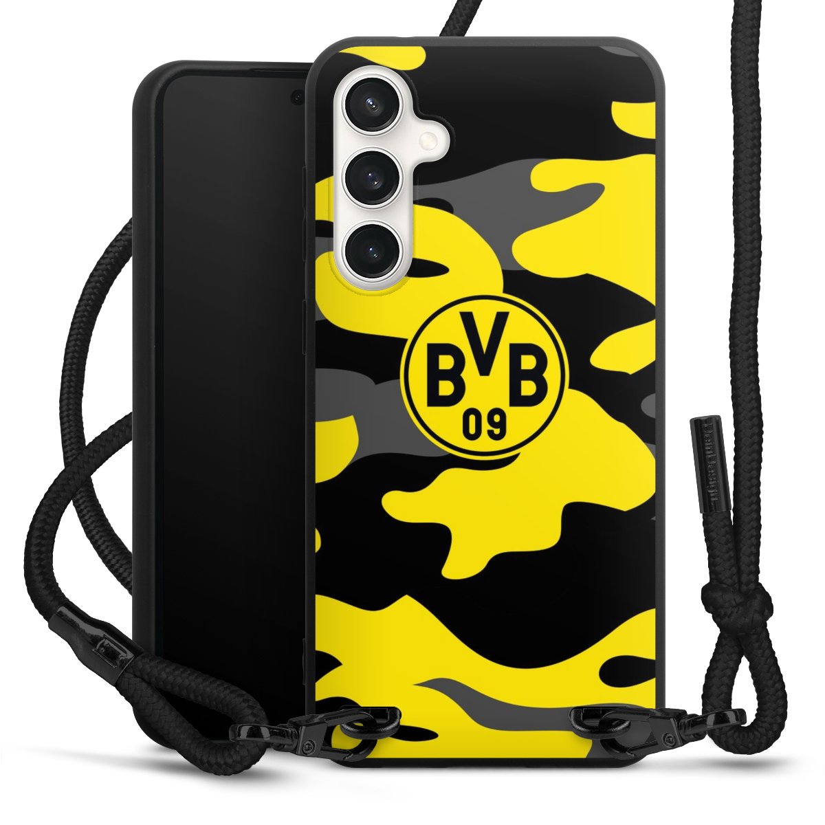 The matt black silicone case is made of flexible TPU (thermoplastic polyurethane) and offers robust protection. The durable, unbreakable material makes the cover flexible and dimensionally stable at the same time. The matte surface makes your design stand out more and is less susceptible to fingerprints and dirt. The stylish trend accessory fits comfortably in the hand and is perfectly complemented by the fabric (polyester) mobile phone strap. The braided fabric strap is approx. 1.70 metres long with a diameter of approx. 0.5 cm. Due to the special knotting technique, the length of the strap can be adjusted by simply pulling it, so that you can adapt it individually to your wishes. The practical case to wear around your neck is available with the fabric strap in black. As a little icing on the cake, we have provided the strap with a chic metal fastener in matt black. The strap is securely fastened to the case with loops made of high-quality genuine leather and press studs. The ends of the fabric strap are covered with metallic end caps and thus protected from fraying.