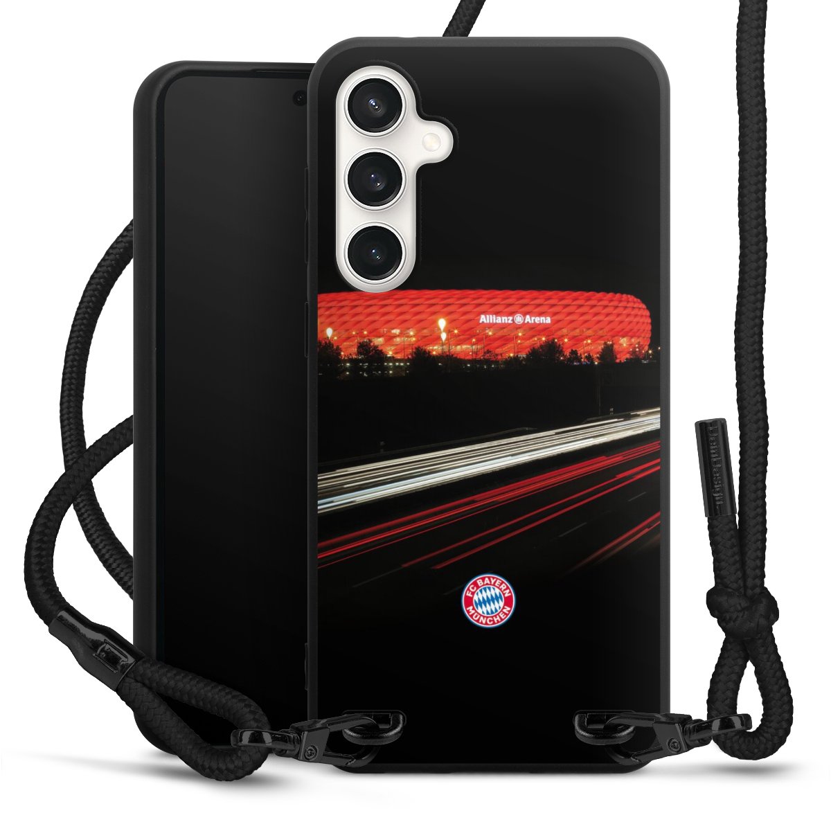 The matt black silicone case is made of flexible TPU (thermoplastic polyurethane) and offers robust protection. The durable, unbreakable material makes the cover flexible and dimensionally stable at the same time. The matte surface makes your design stand out more and is less susceptible to fingerprints and dirt. The stylish trend accessory fits comfortably in the hand and is perfectly complemented by the fabric (polyester) mobile phone strap. The braided fabric strap is approx. 1.70 metres long with a diameter of approx. 0.5 cm. Due to the special knotting technique, the length of the strap can be adjusted by simply pulling it, so that you can adapt it individually to your wishes. The practical case to wear around your neck is available with the fabric strap in black. As a little icing on the cake, we have provided the strap with a chic metal fastener in matt black. The strap is securely fastened to the case with loops made of high-quality genuine leather and press studs. The ends of the fabric strap are covered with metallic end caps and thus protected from fraying.