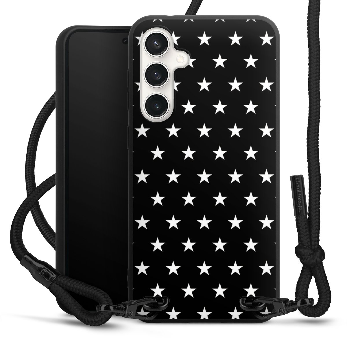 The matt black silicone case is made of flexible TPU (thermoplastic polyurethane) and offers robust protection. The durable, unbreakable material makes the cover flexible and dimensionally stable at the same time. The matte surface makes your design stand out more and is less susceptible to fingerprints and dirt. The stylish trend accessory fits comfortably in the hand and is perfectly complemented by the fabric (polyester) mobile phone strap. The braided fabric strap is approx. 1.70 metres long with a diameter of approx. 0.5 cm. Due to the special knotting technique, the length of the strap can be adjusted by simply pulling it, so that you can adapt it individually to your wishes. The practical case to wear around your neck is available with the fabric strap in black. As a little icing on the cake, we have provided the strap with a chic metal fastener in matt black. The strap is securely fastened to the case with loops made of high-quality genuine leather and press studs. The ends of the fabric strap are covered with metallic end caps and thus protected from fraying.