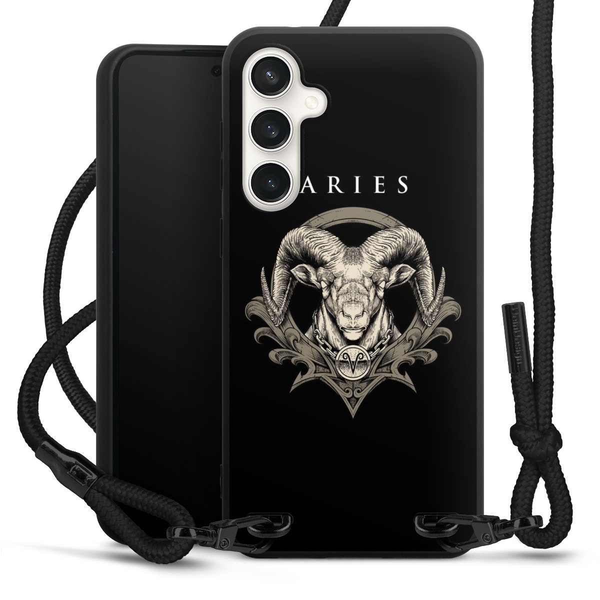 The matt black silicone case is made of flexible TPU (thermoplastic polyurethane) and offers robust protection. The durable, unbreakable material makes the cover flexible and dimensionally stable at the same time. The matte surface makes your design stand out more and is less susceptible to fingerprints and dirt. The stylish trend accessory fits comfortably in the hand and is perfectly complemented by the fabric (polyester) mobile phone strap. The braided fabric strap is approx. 1.70 metres long with a diameter of approx. 0.5 cm. Due to the special knotting technique, the length of the strap can be adjusted by simply pulling it, so that you can adapt it individually to your wishes. The practical case to wear around your neck is available with the fabric strap in black. As a little icing on the cake, we have provided the strap with a chic metal fastener in matt black. The strap is securely fastened to the case with loops made of high-quality genuine leather and press studs. The ends of the fabric strap are covered with metallic end caps and thus protected from fraying.