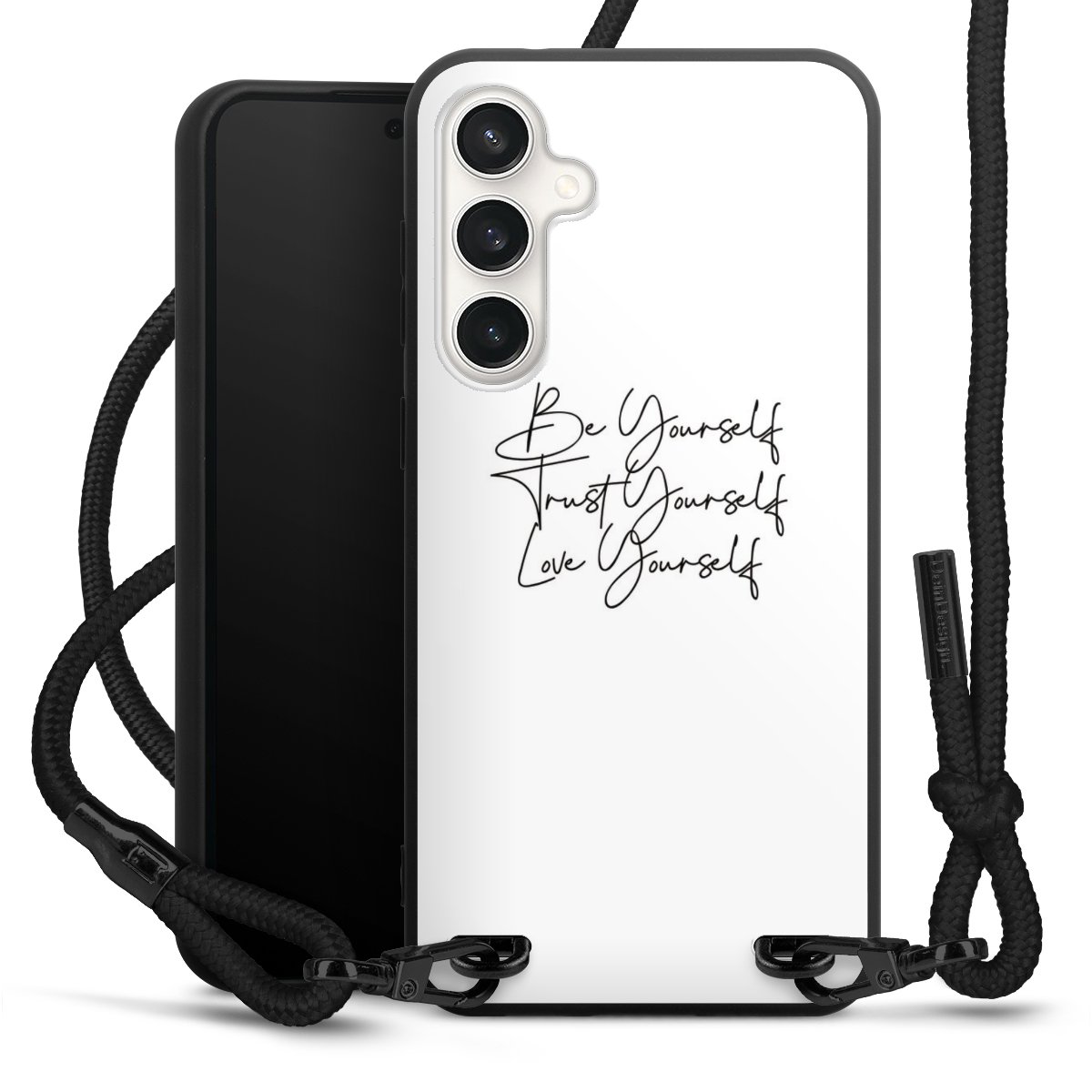 The matt black silicone case is made of flexible TPU (thermoplastic polyurethane) and offers robust protection. The durable, unbreakable material makes the cover flexible and dimensionally stable at the same time. The matte surface makes your design stand out more and is less susceptible to fingerprints and dirt. The stylish trend accessory fits comfortably in the hand and is perfectly complemented by the fabric (polyester) mobile phone strap. The braided fabric strap is approx. 1.70 metres long with a diameter of approx. 0.5 cm. Due to the special knotting technique, the length of the strap can be adjusted by simply pulling it, so that you can adapt it individually to your wishes. The practical case to wear around your neck is available with the fabric strap in black. As a little icing on the cake, we have provided the strap with a chic metal fastener in matt black. The strap is securely fastened to the case with loops made of high-quality genuine leather and press studs. The ends of the fabric strap are covered with metallic end caps and thus protected from fraying.