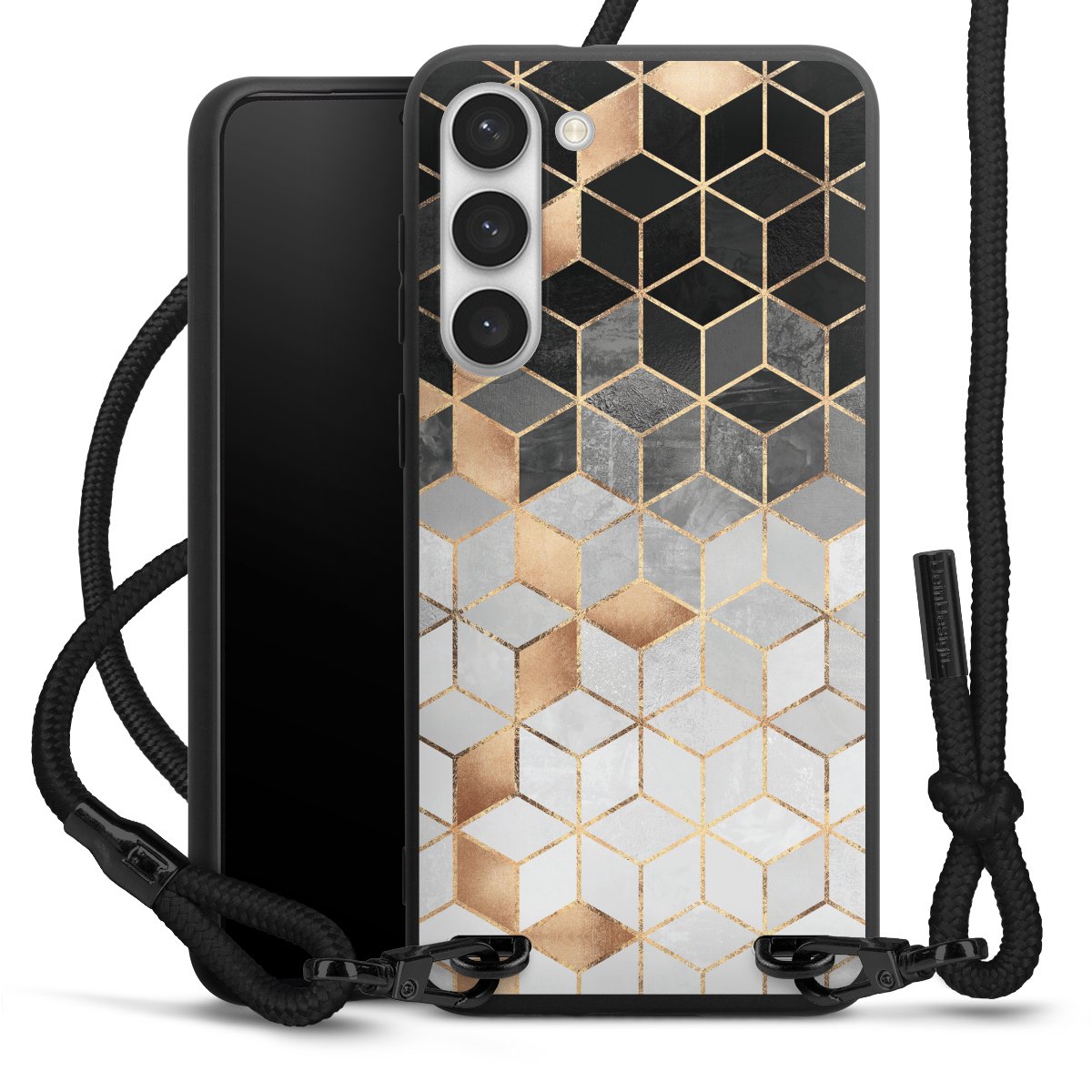 The matt black silicone case is made of flexible TPU (thermoplastic polyurethane) and offers robust protection. The durable, unbreakable material makes the cover flexible and dimensionally stable at the same time. The matte surface makes your design stand out more and is less susceptible to fingerprints and dirt. The stylish trend accessory fits comfortably in the hand and is perfectly complemented by the fabric (polyester) mobile phone strap. The braided fabric strap is approx. 1.70 metres long with a diameter of approx. 0.5 cm. Due to the special knotting technique, the length of the strap can be adjusted by simply pulling it, so that you can adapt it individually to your wishes. The practical case to wear around your neck is available with the fabric strap in black. As a little icing on the cake, we have provided the strap with a chic metal fastener in matt black. The strap is securely fastened to the case with loops made of high-quality genuine leather and press studs. The ends of the fabric strap are covered with metallic end caps and thus protected from fraying.