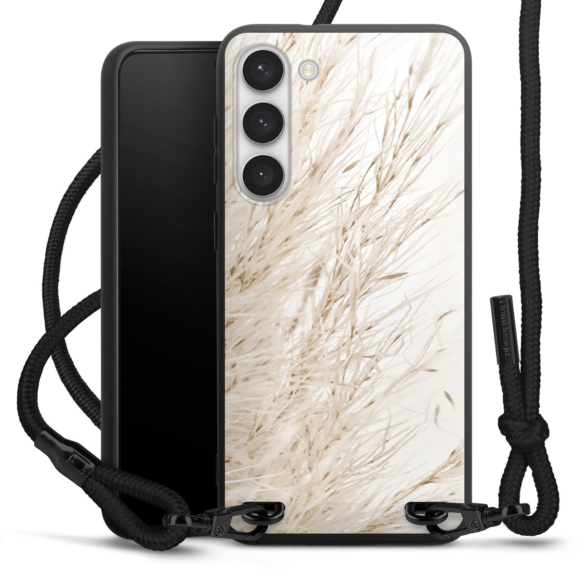 The matt black silicone case is made of flexible TPU (thermoplastic polyurethane) and offers robust protection. The durable, unbreakable material makes the cover flexible and dimensionally stable at the same time. The matte surface makes your design stand out more and is less susceptible to fingerprints and dirt. The stylish trend accessory fits comfortably in the hand and is perfectly complemented by the fabric (polyester) mobile phone strap. The braided fabric strap is approx. 1.70 metres long with a diameter of approx. 0.5 cm. Due to the special knotting technique, the length of the strap can be adjusted by simply pulling it, so that you can adapt it individually to your wishes. The practical case to wear around your neck is available with the fabric strap in black. As a little icing on the cake, we have provided the strap with a chic metal fastener in matt black. The strap is securely fastened to the case with loops made of high-quality genuine leather and press studs. The ends of the fabric strap are covered with metallic end caps and thus protected from fraying.