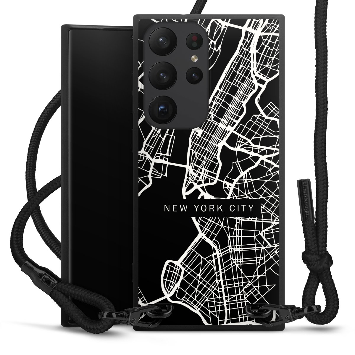 The matt black silicone case is made of flexible TPU (thermoplastic polyurethane) and offers robust protection. The durable, unbreakable material makes the cover flexible and dimensionally stable at the same time. The matte surface makes your design stand out more and is less susceptible to fingerprints and dirt. The stylish trend accessory fits comfortably in the hand and is perfectly complemented by the fabric (polyester) mobile phone strap. The braided fabric strap is approx. 1.70 metres long with a diameter of approx. 0.5 cm. Due to the special knotting technique, the length of the strap can be adjusted by simply pulling it, so that you can adapt it individually to your wishes. The practical case to wear around your neck is available with the fabric strap in black. As a little icing on the cake, we have provided the strap with a chic metal fastener in matt black. The strap is securely fastened to the case with loops made of high-quality genuine leather and press studs. The ends of the fabric strap are covered with metallic end caps and thus protected from fraying.