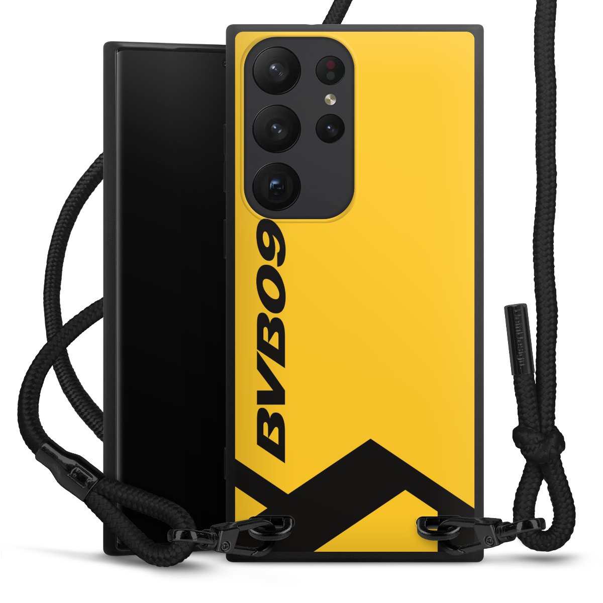 The matt black silicone case is made of flexible TPU (thermoplastic polyurethane) and offers robust protection. The durable, unbreakable material makes the cover flexible and dimensionally stable at the same time. The matte surface makes your design stand out more and is less susceptible to fingerprints and dirt. The stylish trend accessory fits comfortably in the hand and is perfectly complemented by the fabric (polyester) mobile phone strap. The braided fabric strap is approx. 1.70 metres long with a diameter of approx. 0.5 cm. Due to the special knotting technique, the length of the strap can be adjusted by simply pulling it, so that you can adapt it individually to your wishes. The practical case to wear around your neck is available with the fabric strap in black. As a little icing on the cake, we have provided the strap with a chic metal fastener in matt black. The strap is securely fastened to the case with loops made of high-quality genuine leather and press studs. The ends of the fabric strap are covered with metallic end caps and thus protected from fraying.