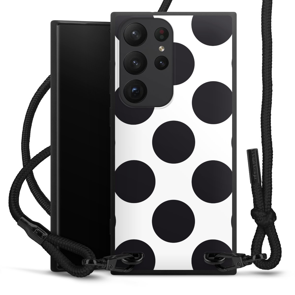 The matt black silicone case is made of flexible TPU (thermoplastic polyurethane) and offers robust protection. The durable, unbreakable material makes the cover flexible and dimensionally stable at the same time. The matte surface makes your design stand out more and is less susceptible to fingerprints and dirt. The stylish trend accessory fits comfortably in the hand and is perfectly complemented by the fabric (polyester) mobile phone strap. The braided fabric strap is approx. 1.70 metres long with a diameter of approx. 0.5 cm. Due to the special knotting technique, the length of the strap can be adjusted by simply pulling it, so that you can adapt it individually to your wishes. The practical case to wear around your neck is available with the fabric strap in black. As a little icing on the cake, we have provided the strap with a chic metal fastener in matt black. The strap is securely fastened to the case with loops made of high-quality genuine leather and press studs. The ends of the fabric strap are covered with metallic end caps and thus protected from fraying.