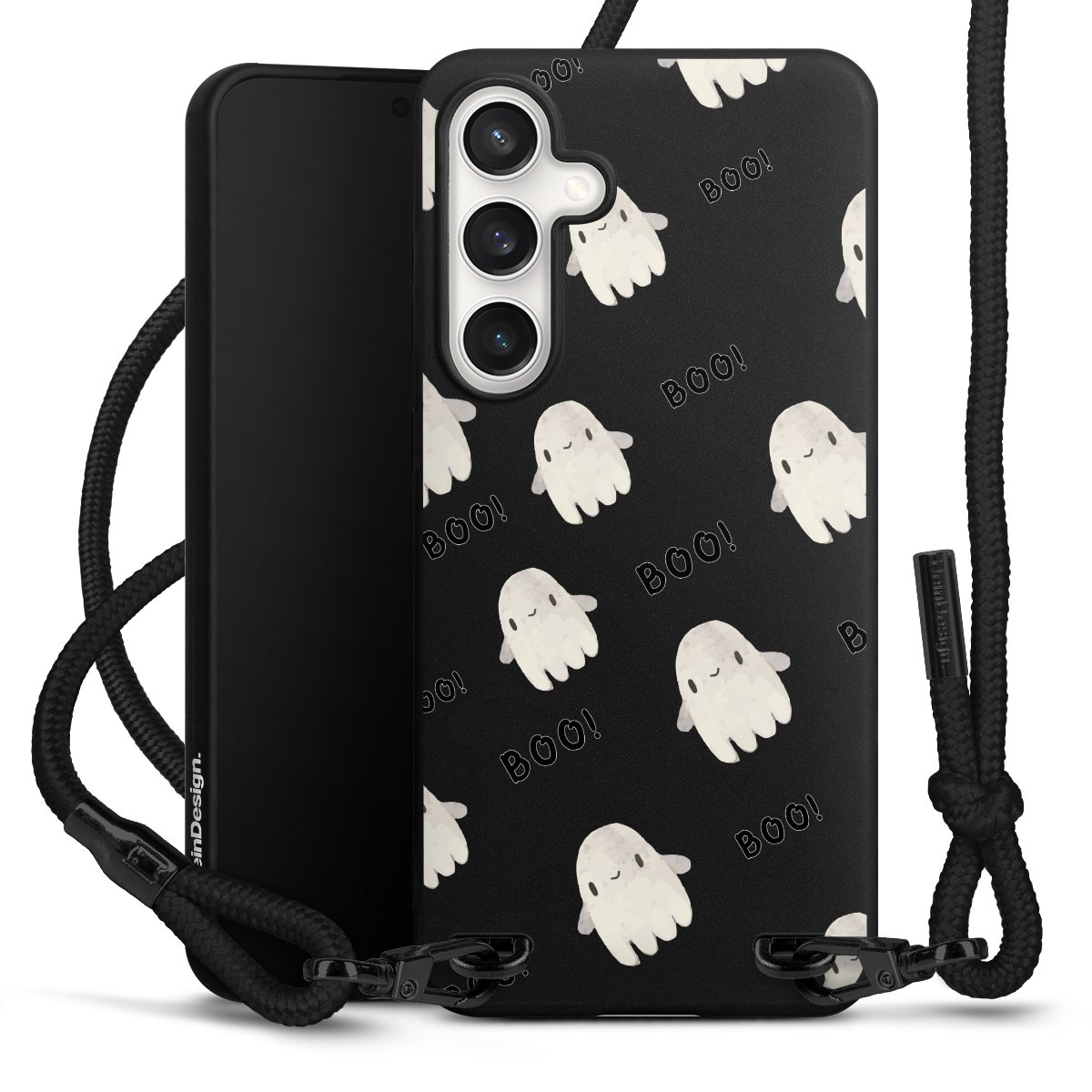 The matt black silicone case is made of flexible TPU (thermoplastic polyurethane) and offers robust protection. The durable, unbreakable material makes the cover flexible and dimensionally stable at the same time. The matte surface makes your design stand out more and is less susceptible to fingerprints and dirt. The stylish trend accessory fits comfortably in the hand and is perfectly complemented by the fabric (polyester) mobile phone strap. The braided fabric strap is approx. 1.70 metres long with a diameter of approx. 0.5 cm. Due to the special knotting technique, the length of the strap can be adjusted by simply pulling it, so that you can adapt it individually to your wishes. The practical case to wear around your neck is available with the fabric strap in black. As a little icing on the cake, we have provided the strap with a chic metal fastener in matt black. The strap is securely fastened to the case with loops made of high-quality genuine leather and press studs. The ends of the fabric strap are covered with metallic end caps and thus protected from fraying.