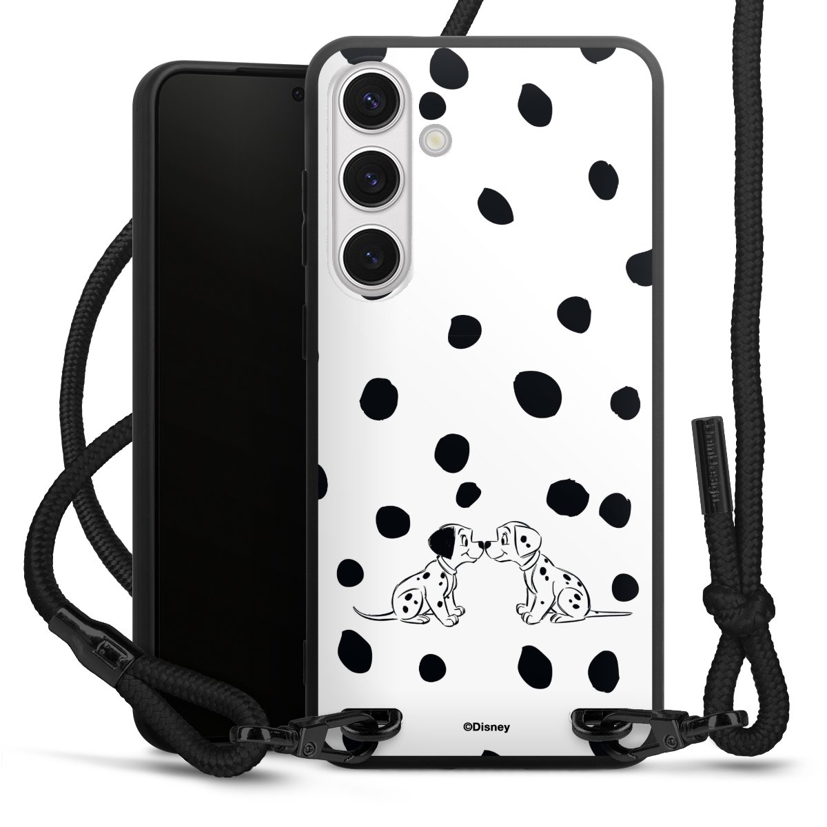 The matt black silicone case is made of flexible TPU (thermoplastic polyurethane) and offers robust protection. The durable, unbreakable material makes the cover flexible and dimensionally stable at the same time. The matte surface makes your design stand out more and is less susceptible to fingerprints and dirt. The stylish trend accessory fits comfortably in the hand and is perfectly complemented by the fabric (polyester) mobile phone strap. The braided fabric strap is approx. 1.70 metres long with a diameter of approx. 0.5 cm. Due to the special knotting technique, the length of the strap can be adjusted by simply pulling it, so that you can adapt it individually to your wishes. The practical case to wear around your neck is available with the fabric strap in black. As a little icing on the cake, we have provided the strap with a chic metal fastener in matt black. The strap is securely fastened to the case with loops made of high-quality genuine leather and press studs. The ends of the fabric strap are covered with metallic end caps and thus protected from fraying.