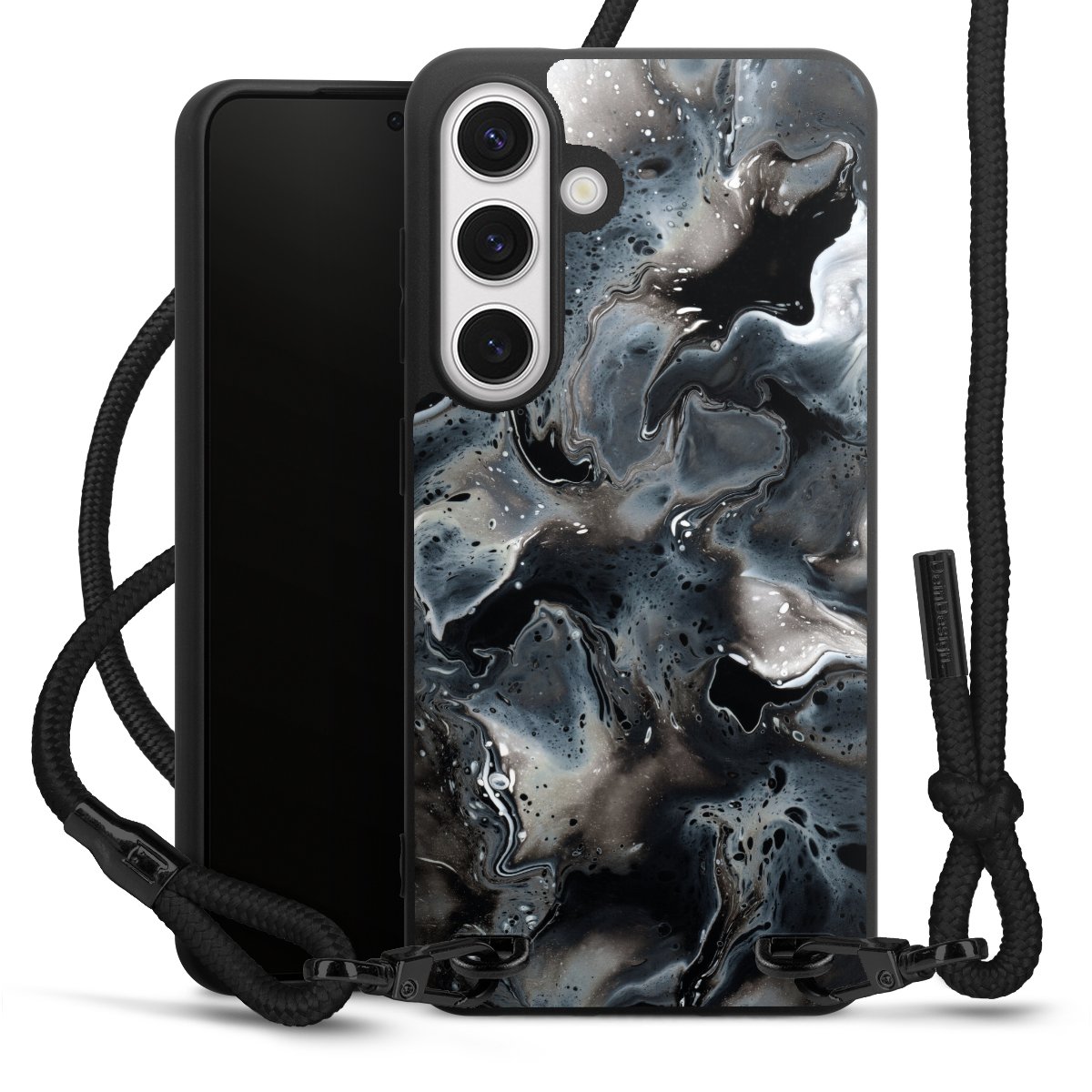 Pure Black: Phone case, fabric strap and metal details in stylish matt black.