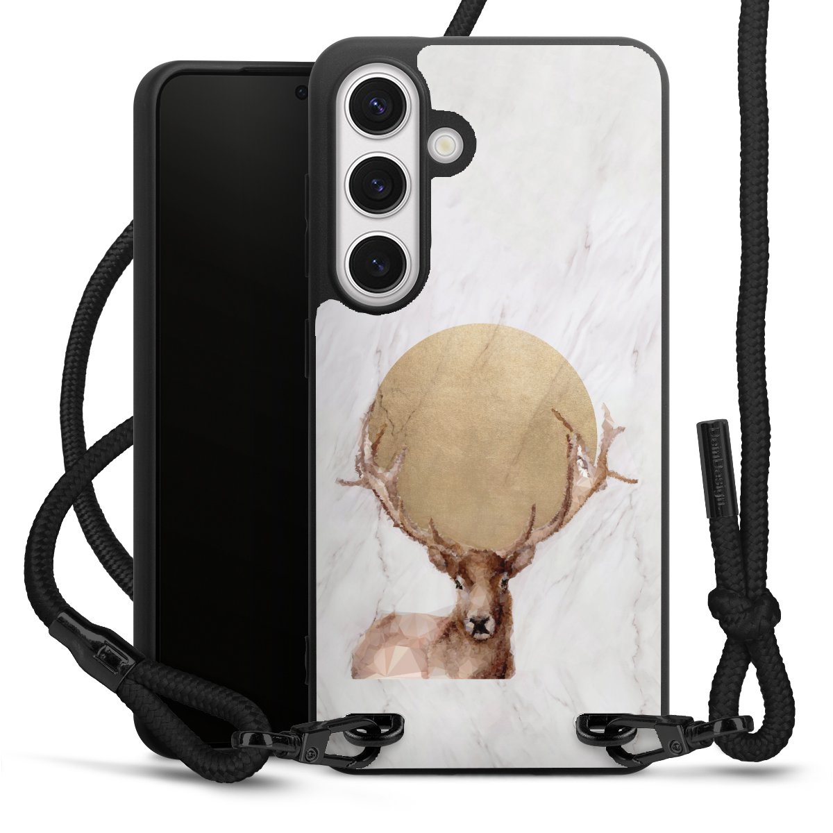 The matt black silicone case is made of flexible TPU (thermoplastic polyurethane) and offers robust protection. The durable, unbreakable material makes the cover flexible and dimensionally stable at the same time. The matte surface makes your design stand out more and is less susceptible to fingerprints and dirt. The stylish trend accessory fits comfortably in the hand and is perfectly complemented by the fabric (polyester) mobile phone strap. The braided fabric strap is approx. 1.70 metres long with a diameter of approx. 0.5 cm. Due to the special knotting technique, the length of the strap can be adjusted by simply pulling it, so that you can adapt it individually to your wishes. The practical case to wear around your neck is available with the fabric strap in black. As a little icing on the cake, we have provided the strap with a chic metal fastener in matt black. The strap is securely fastened to the case with loops made of high-quality genuine leather and press studs. The ends of the fabric strap are covered with metallic end caps and thus protected from fraying.