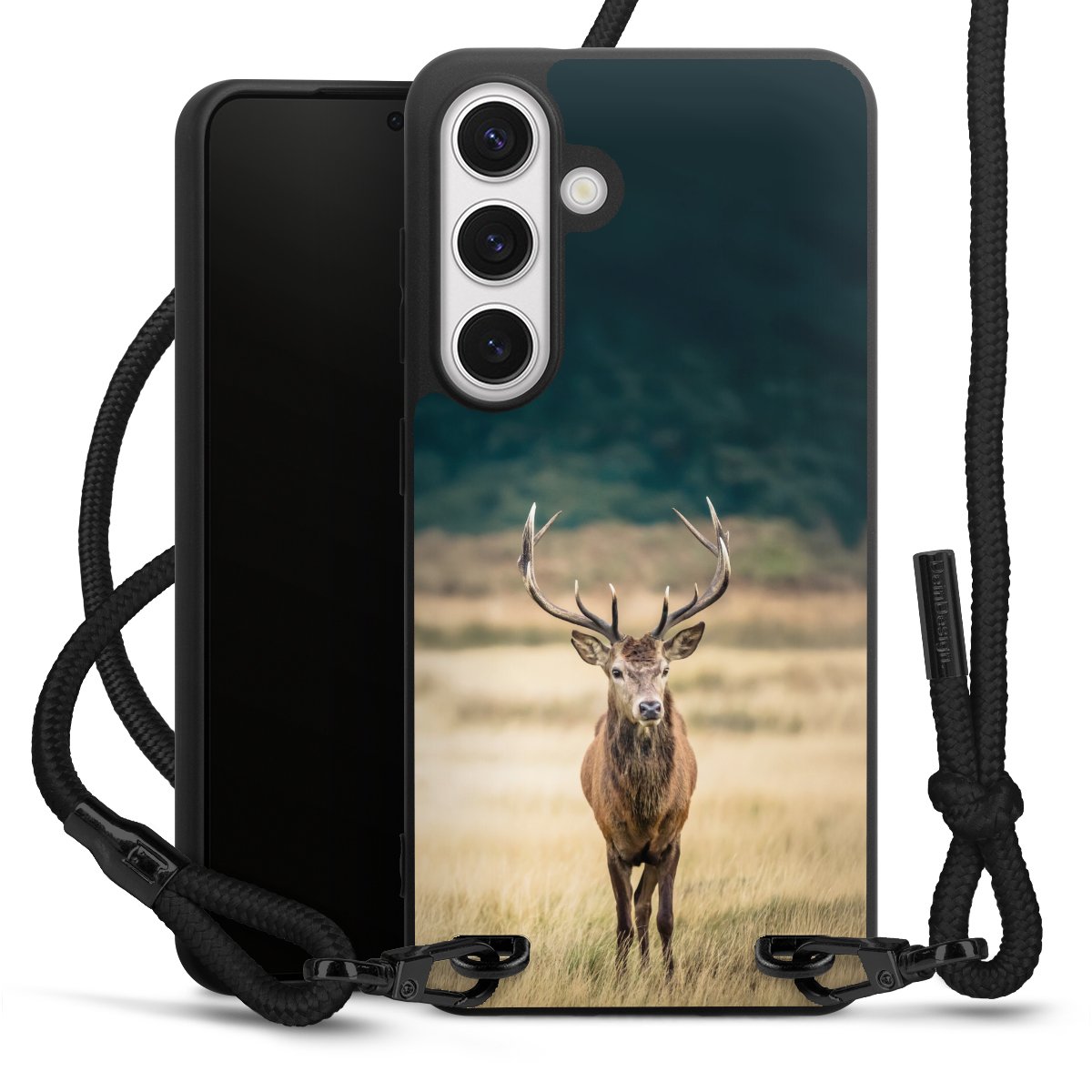 The matt black silicone case is made of flexible TPU (thermoplastic polyurethane) and offers robust protection. The durable, unbreakable material makes the cover flexible and dimensionally stable at the same time. The matte surface makes your design stand out more and is less susceptible to fingerprints and dirt. The stylish trend accessory fits comfortably in the hand and is perfectly complemented by the fabric (polyester) mobile phone strap. The braided fabric strap is approx. 1.70 metres long with a diameter of approx. 0.5 cm. Due to the special knotting technique, the length of the strap can be adjusted by simply pulling it, so that you can adapt it individually to your wishes. The practical case to wear around your neck is available with the fabric strap in black. As a little icing on the cake, we have provided the strap with a chic metal fastener in matt black. The strap is securely fastened to the case with loops made of high-quality genuine leather and press studs. The ends of the fabric strap are covered with metallic end caps and thus protected from fraying.
